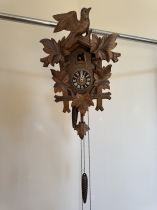 Väggklocka i ek 1900.talets första del H.71cm (nyckel saknas, ngn detalj saknas)