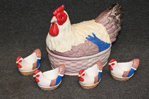24. Ägghöna + 4st äggkoppar, kallmålning (små nagg på ägghöna)