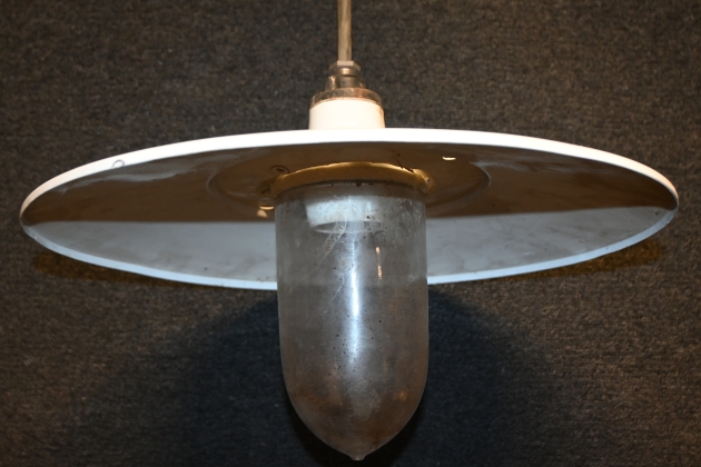 159. Äldre taklampa porslin & glaskupa & plåtskärm 1900.talets försat hälft D.39cm