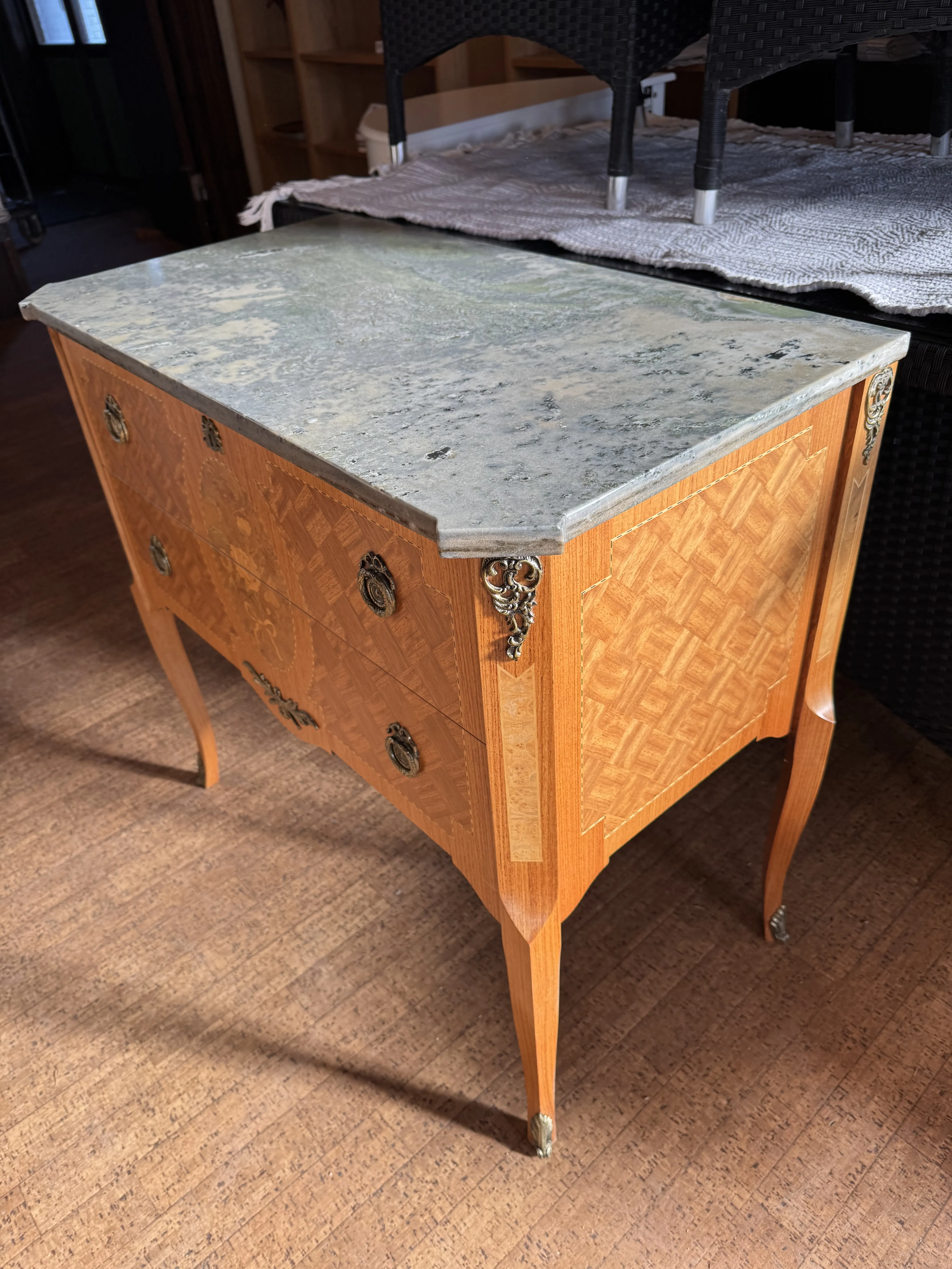567. *2L stilbyrå med marmorskiva i Gustaviansk stil B.80cm Dj.45cm H.75cm (nyckel finns)