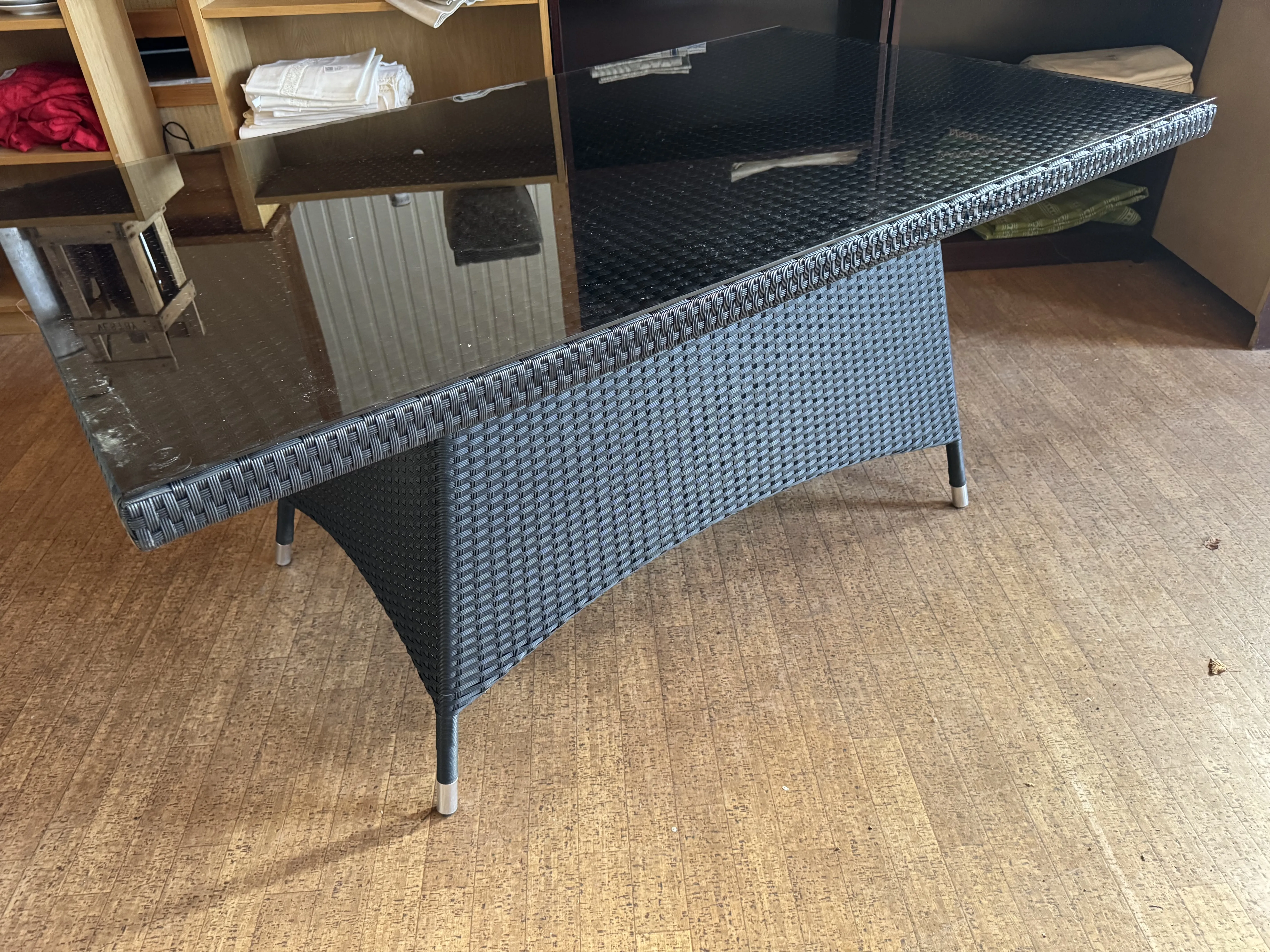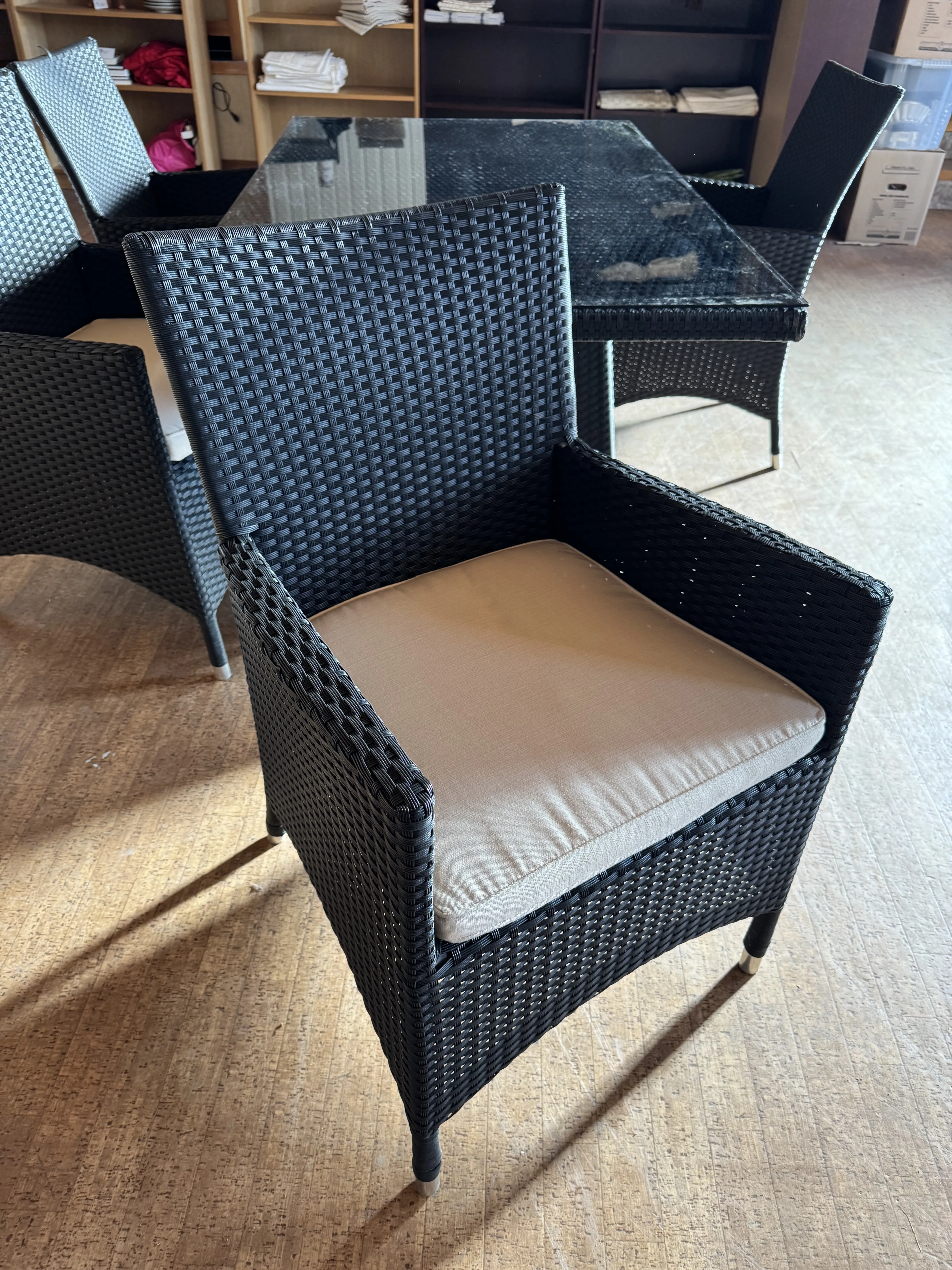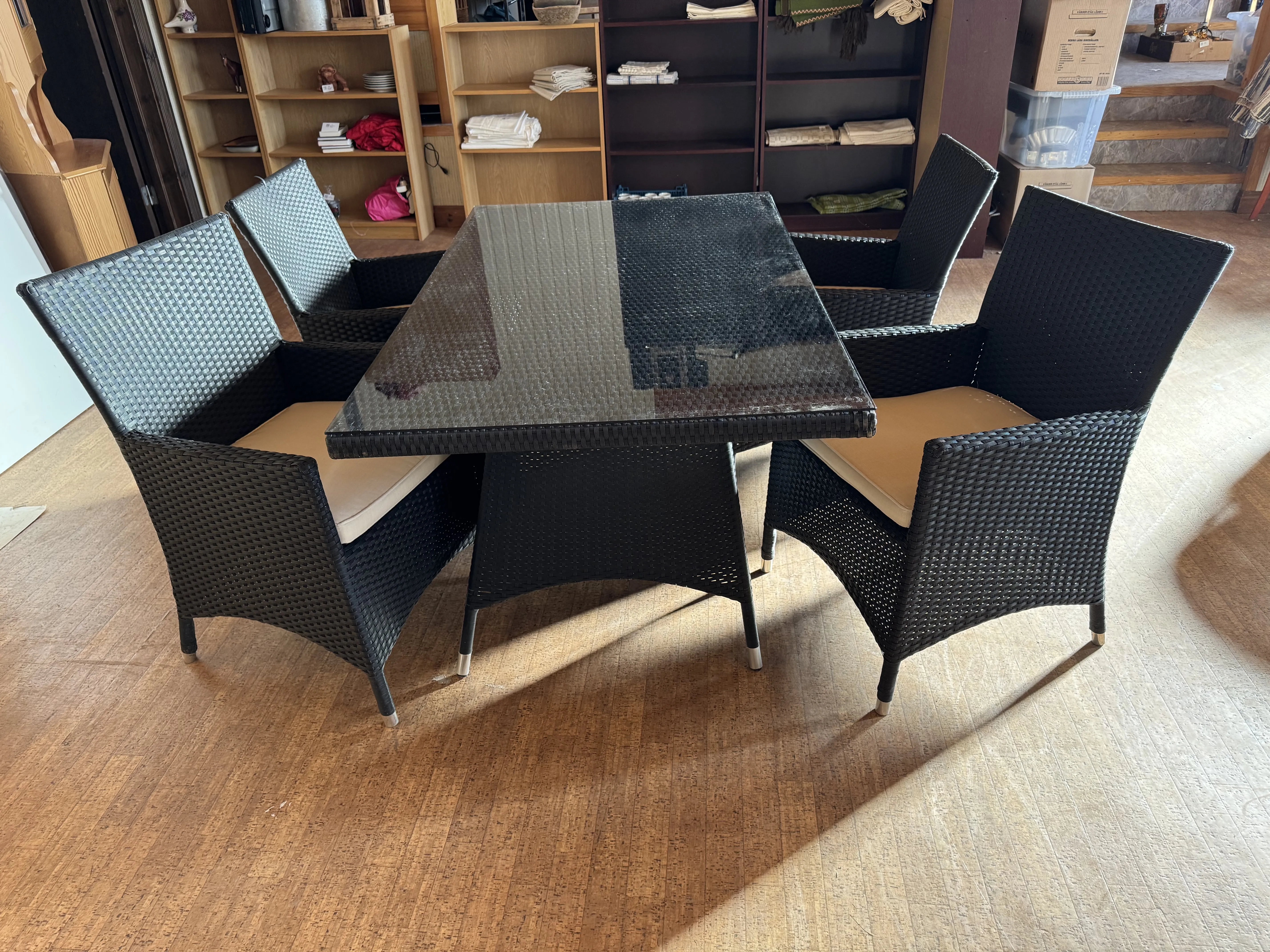 563. *Trädgårdsmöbel, bord + 4st stolar i konstrotting med dynor (bruksslitage) bord L.150cm B.90cm H.73cm