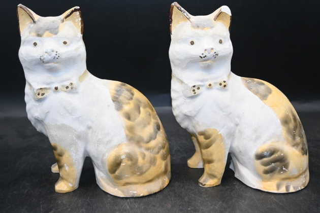 369. 1800-tals kattfiguriner i gips skador H:18 cm färgslitage nagg på ett öra
