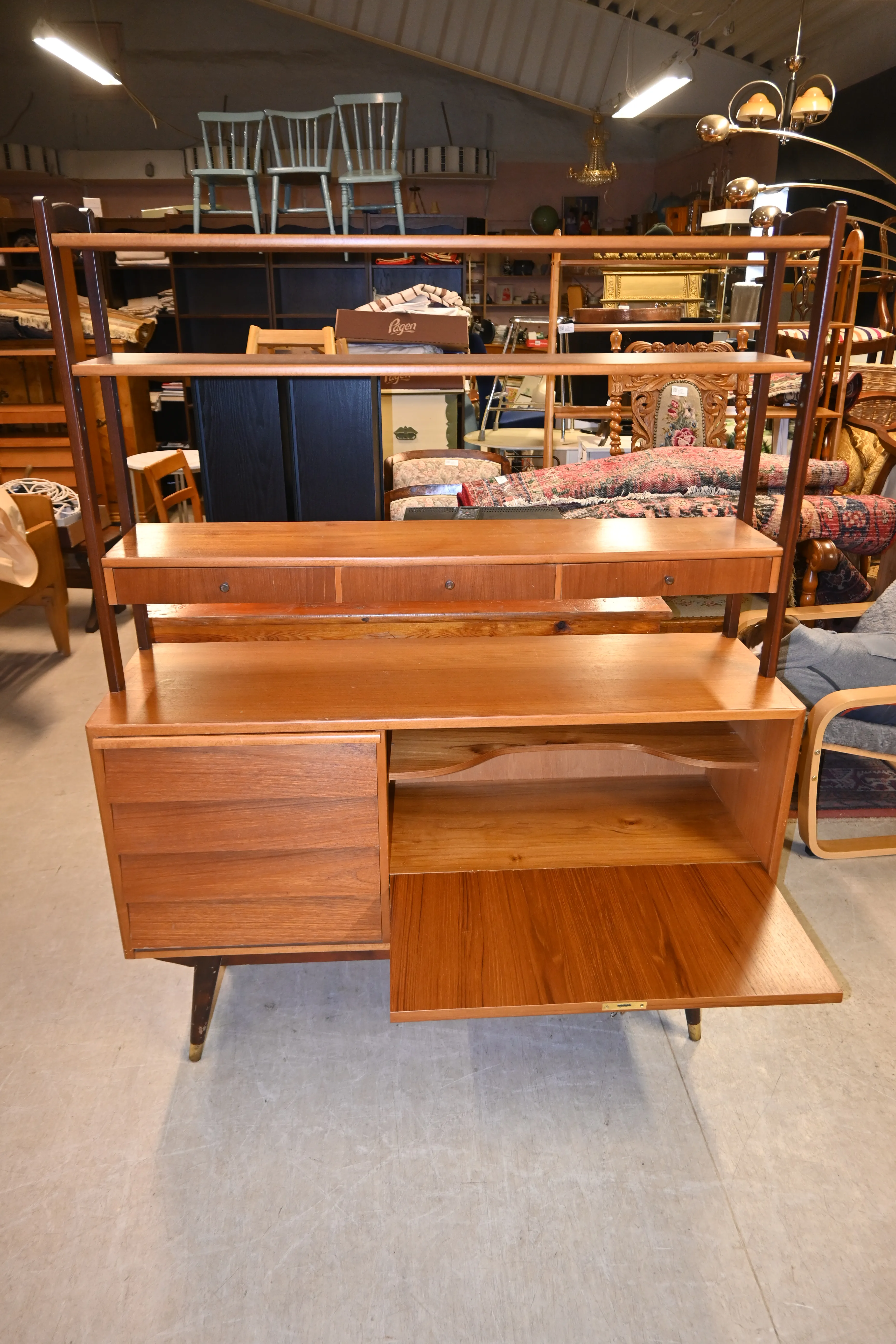 468. 2-delad bokhylla i teak med barskåp 1950.tal H.158cm B.124cm Dj.40cm (bruksslitage. märken förekommer)