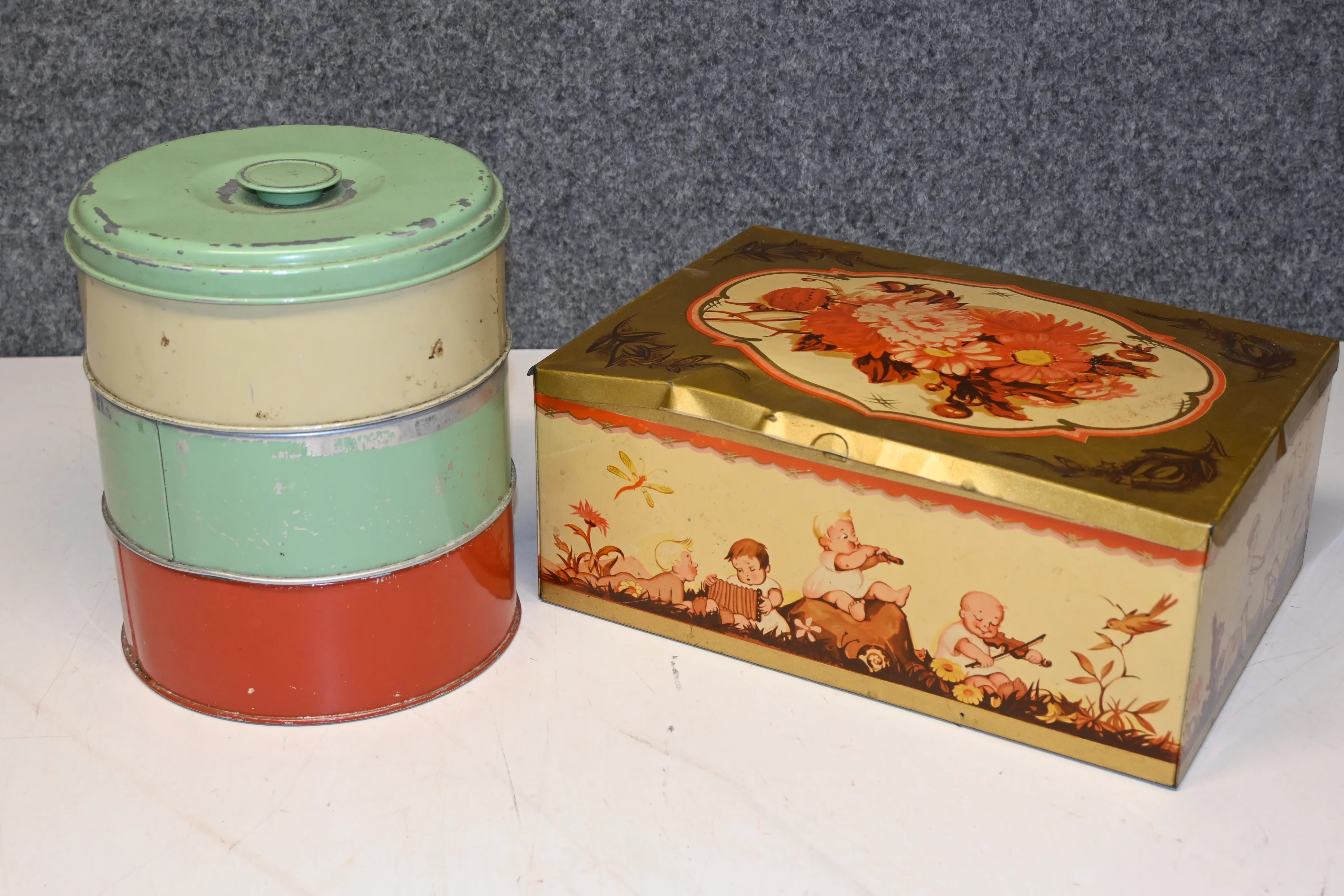 3i1 plåtburk + plåtburk (1 ngt bucklig, färgslitage)