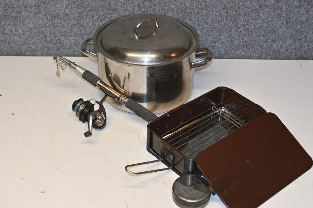 Abu röken, pimpelspö med rulle Viking 820, gryta i rostfritt 10L