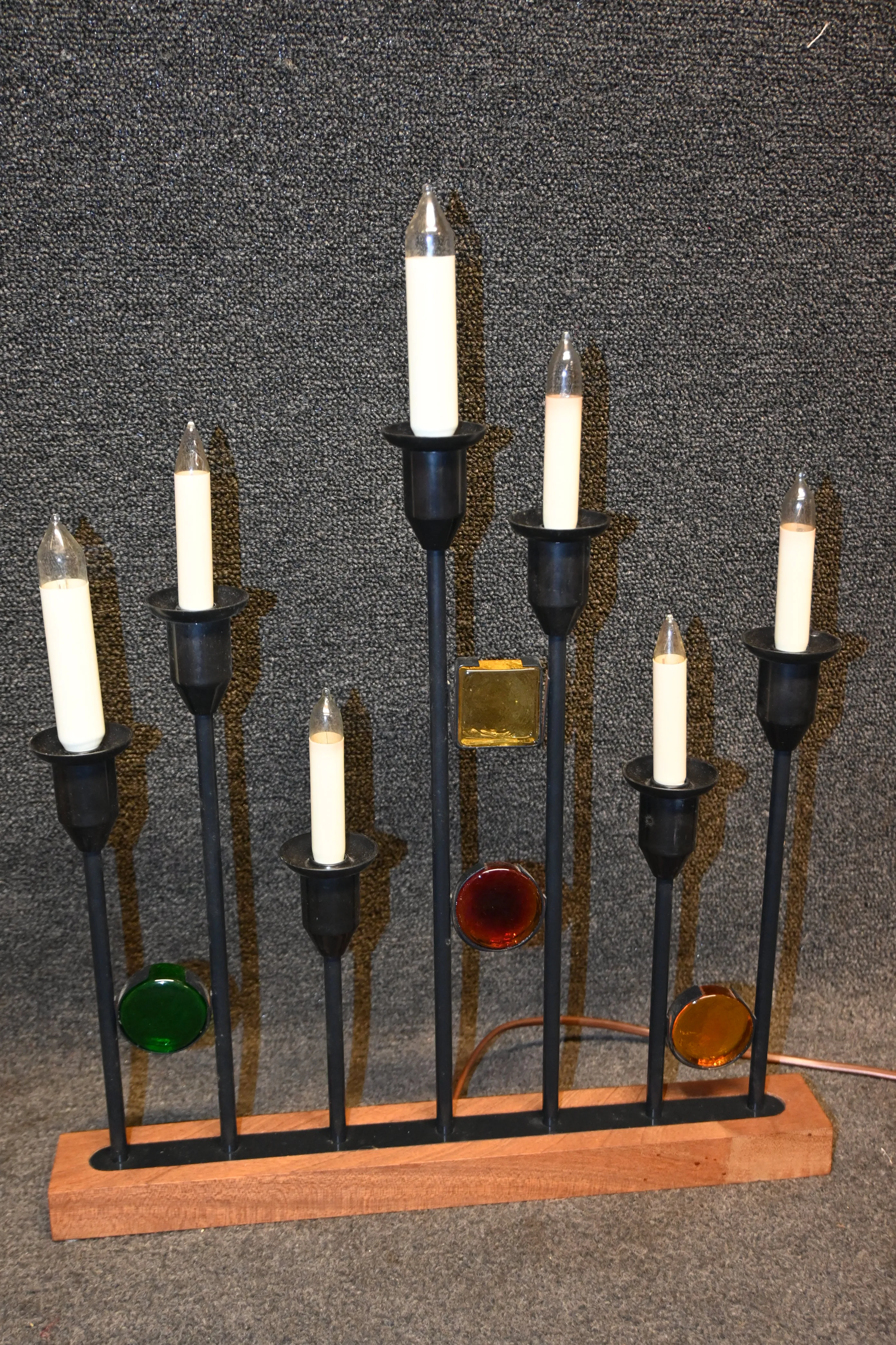 394. Adventsljusstake i teak & smider, Osram typ 92 (lampor bör bytas)