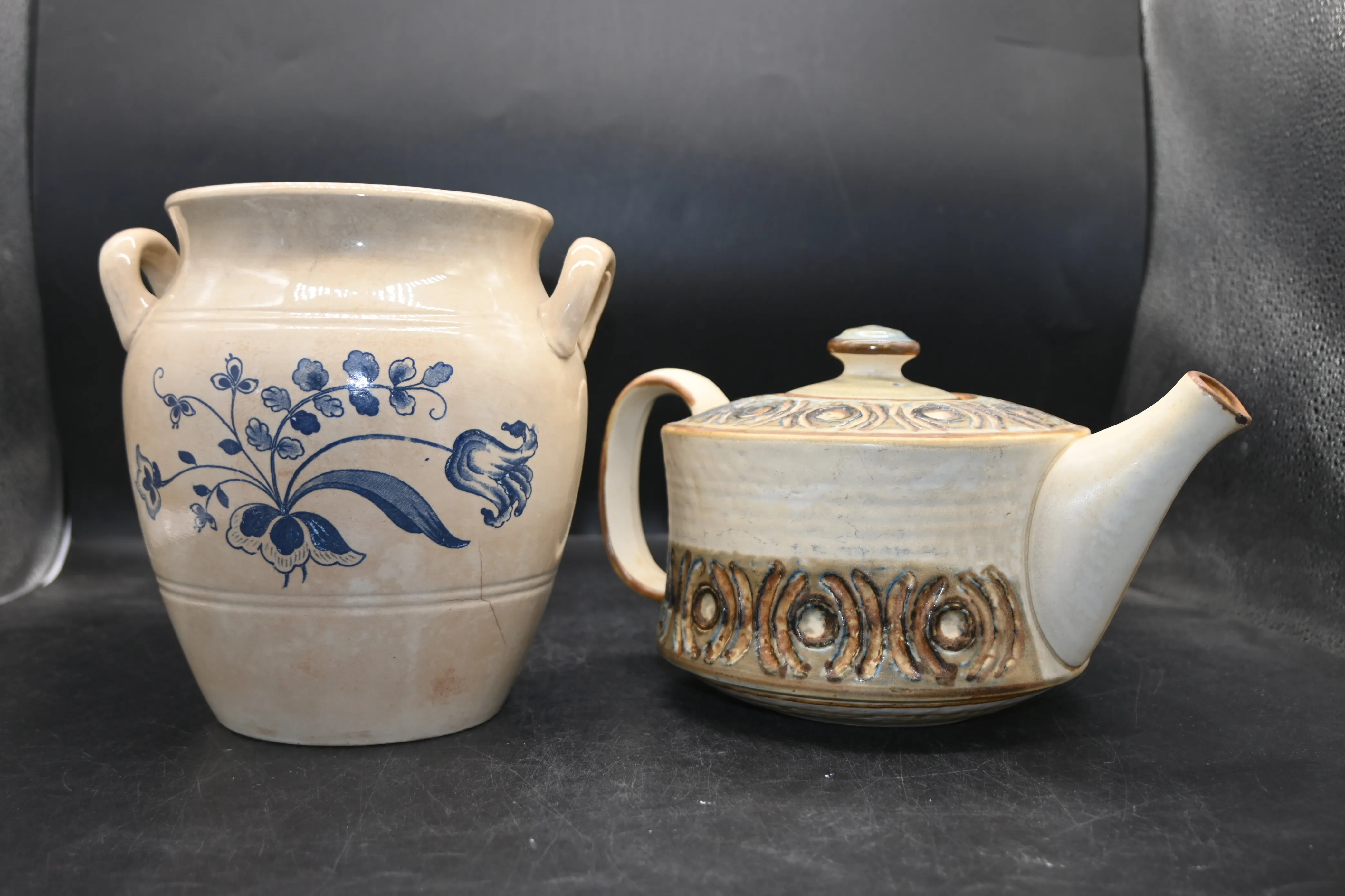 B/V kruka Gustavsberg (missfärgad, spricka) + Tekanna Söholm (nagg vid pipen)