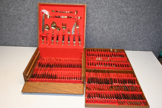 Bestickväska i trä med 143del bestick "Thailand" (1 stor gaffel saknas)