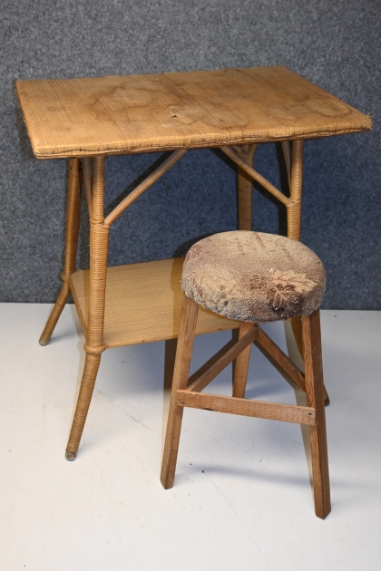 167. Bord m hylla i rotting 1900.talets andra hälft (slitage) + pall (tygslitage)