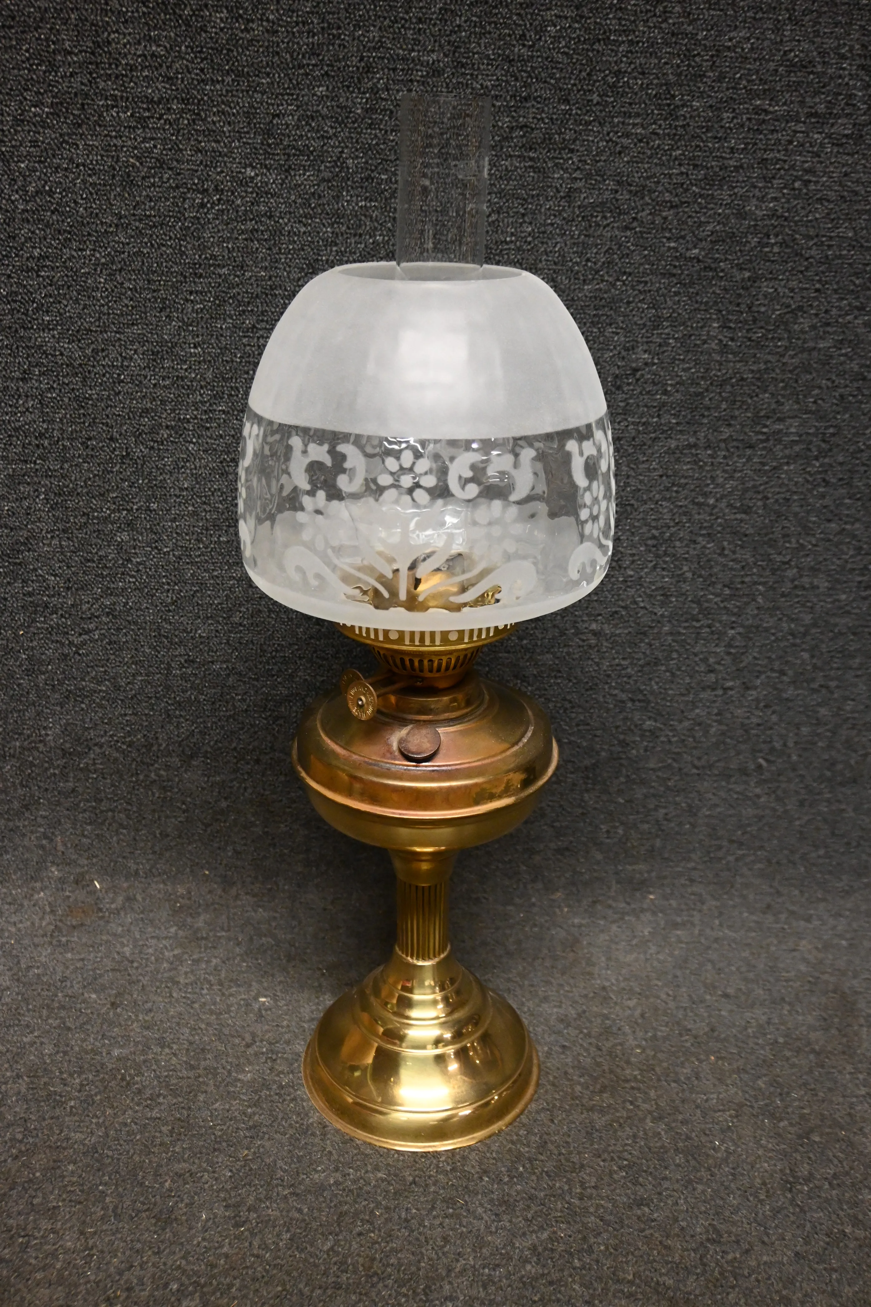 720. Bordsfotogen i mässing med etsad kupa sekelsk 18/1900.tal (spräckt) H:56cm