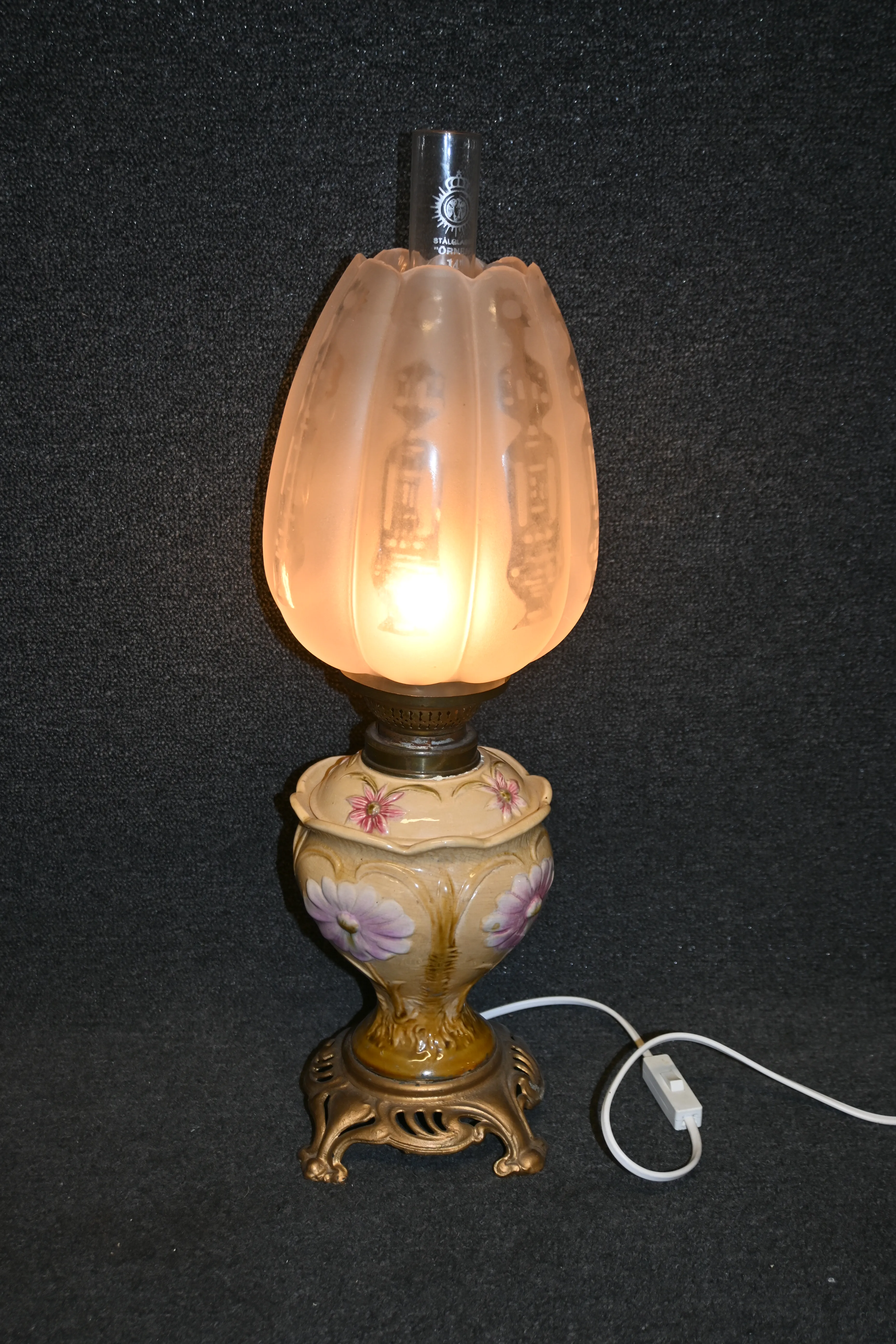 494. Bordsfotogenlampa med etsad tulpankupa, Majolika H.52cm(elektrifierad)