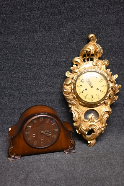 78. Väggklocka i förgylld metallgods H.33cm (glas saknas, defekt gång)