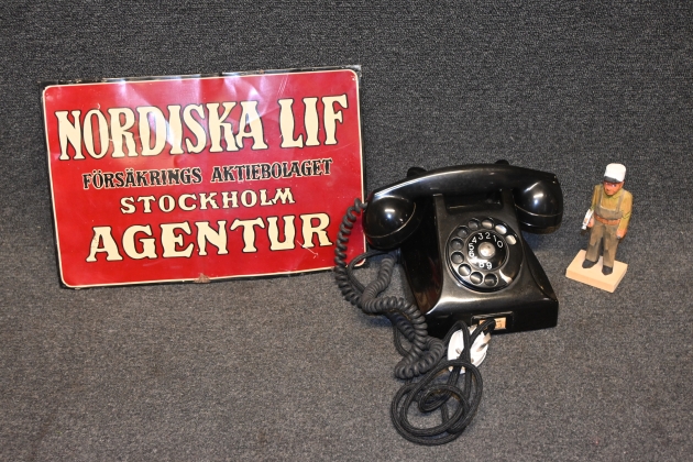 114. Bordstelefon LM Ericsson, träfigurin sign EE-79. plåtskylt (nyare tillverkning)