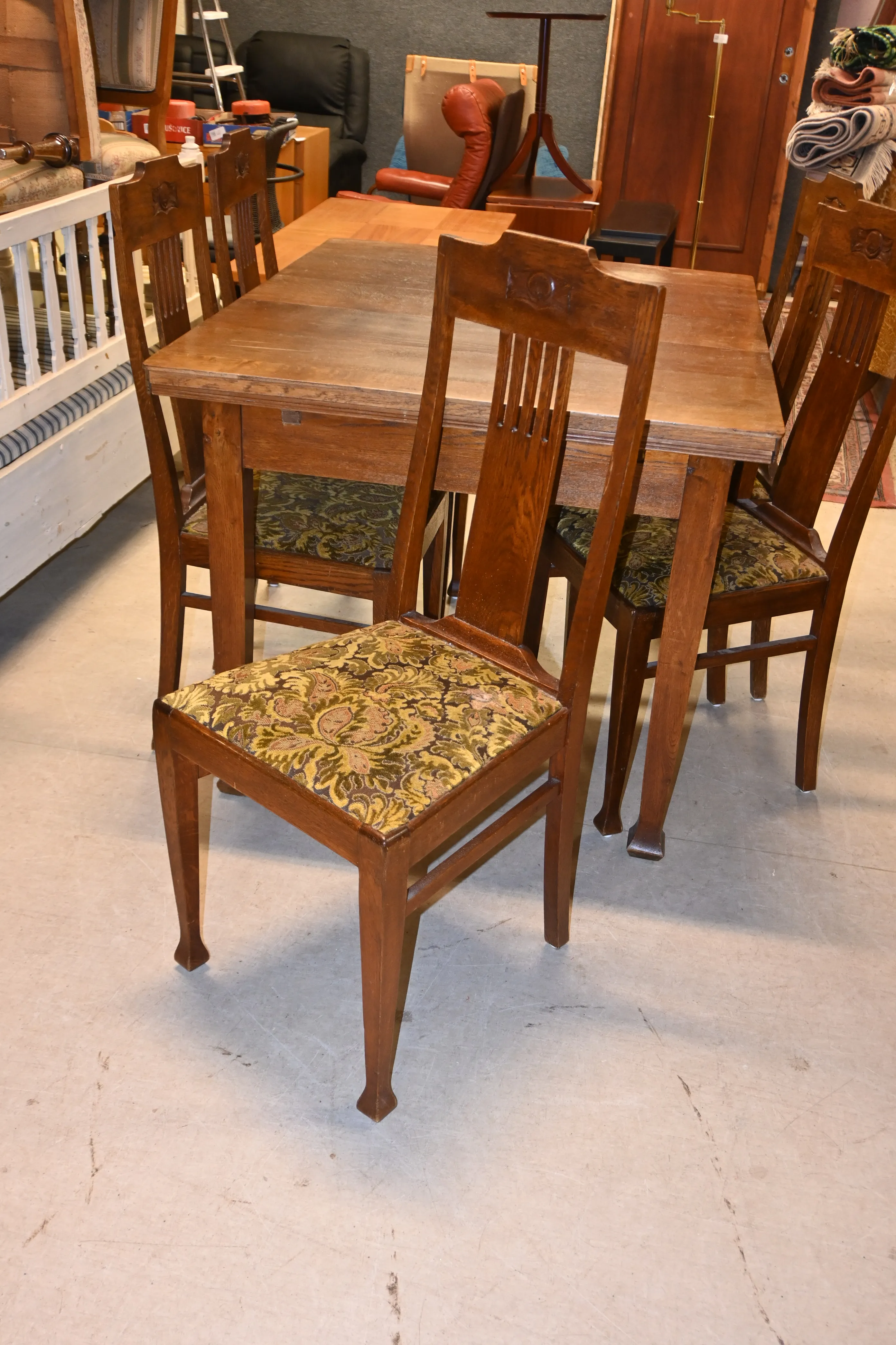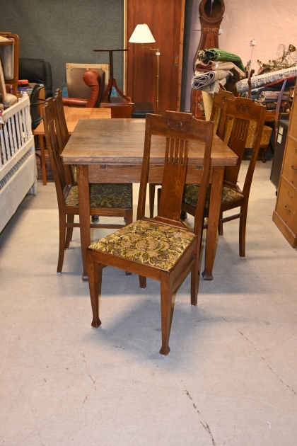 Ekbord med utdragsskivor L.110-200cm B.91cm H.77cm + 5st stolar "Äpplet" 1900.talets första del (åldersrelaterad slitage)
