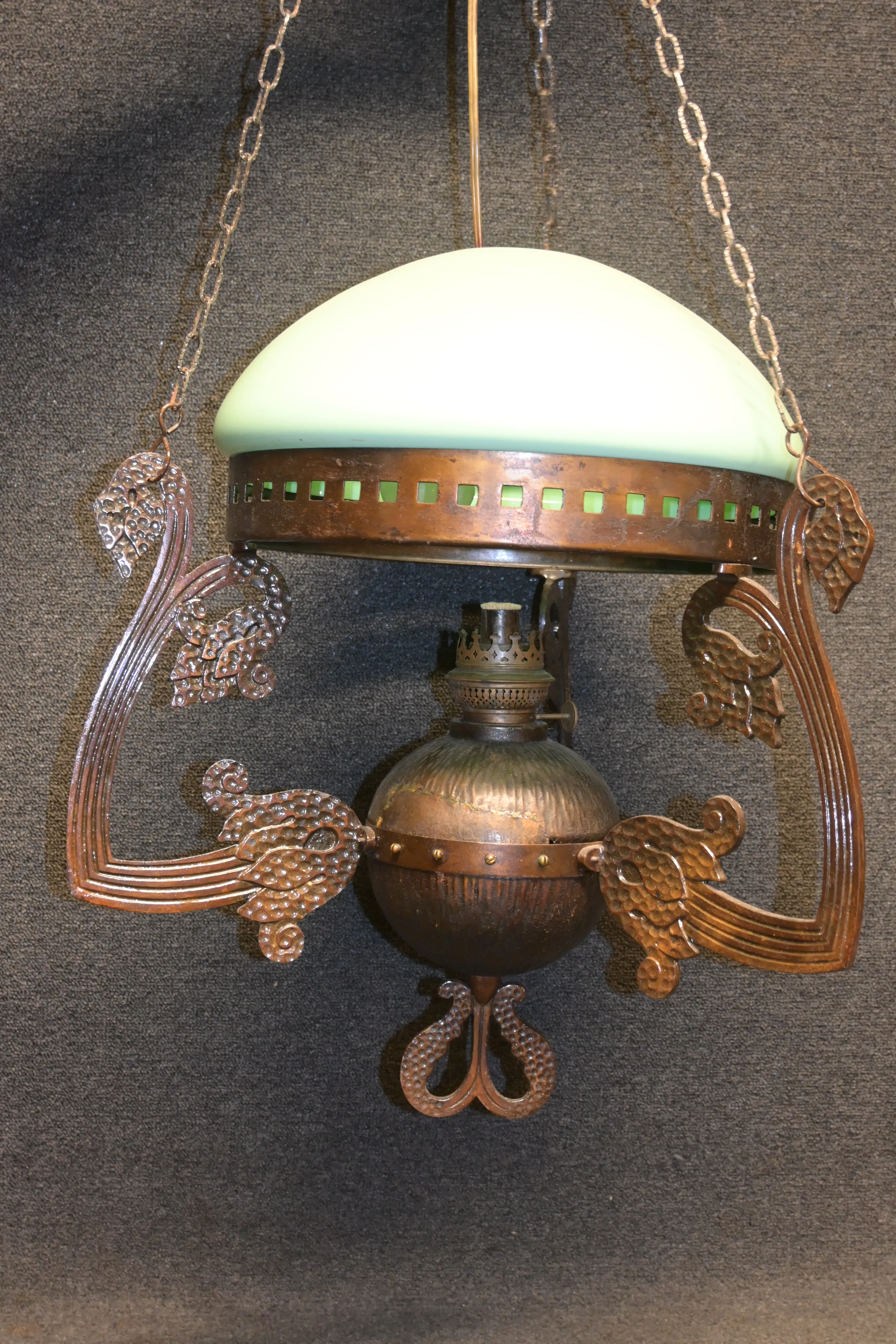 Elektrifierad takfotogenlampa tot H.95cm D.50cm (skada på kupa, oljehus defekt)