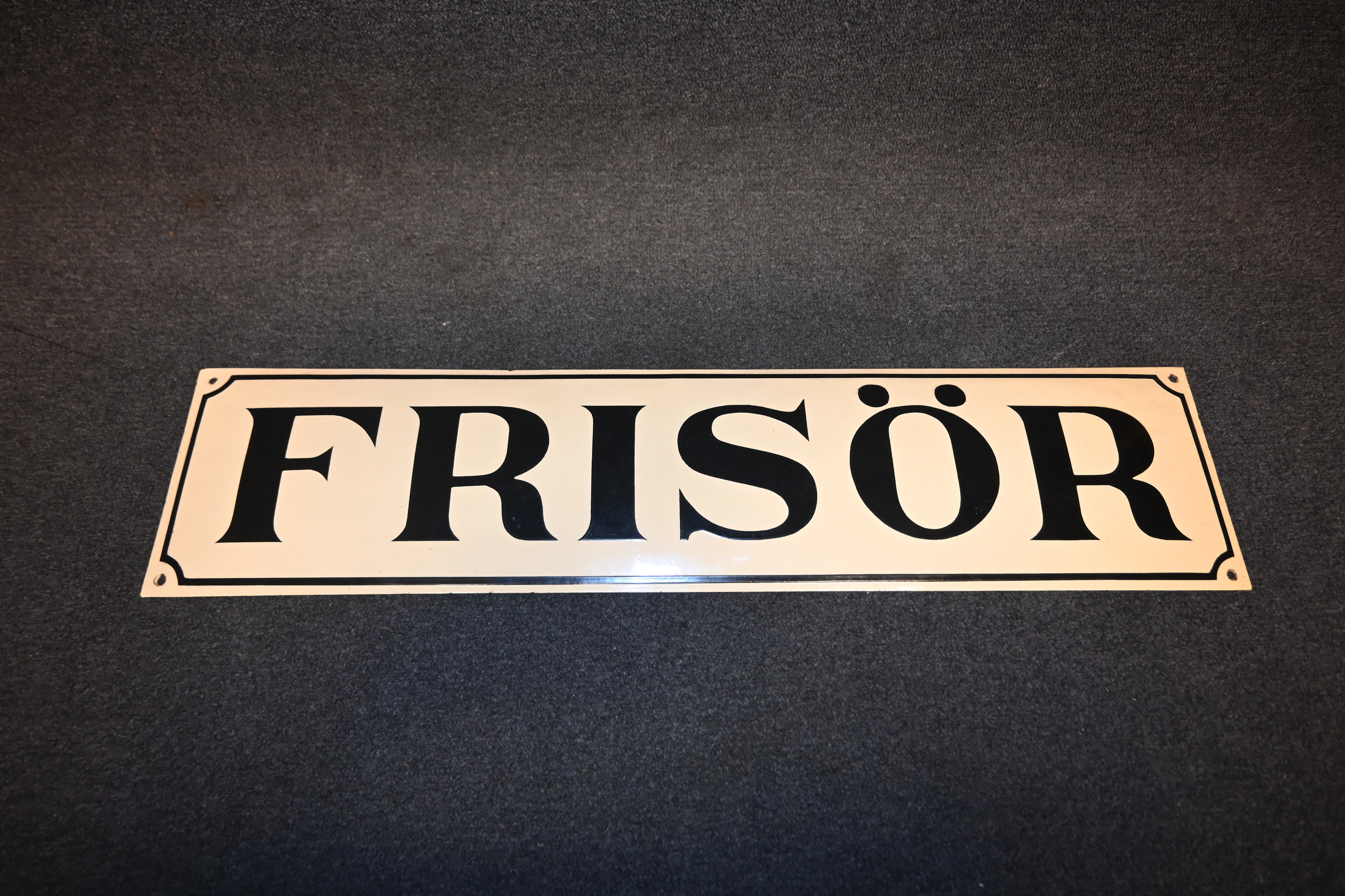 338. Emaljeradskylt, Frisör 17.5x73cm