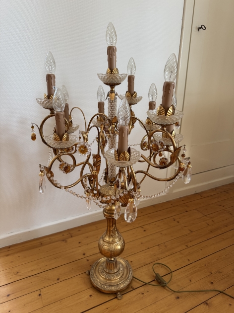 464. Förgylld kandelaber med prismor elektrifierad H.105cm B.55cm