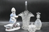 Figurin i porslin + blomkorg, lockask, karaff i pressglas