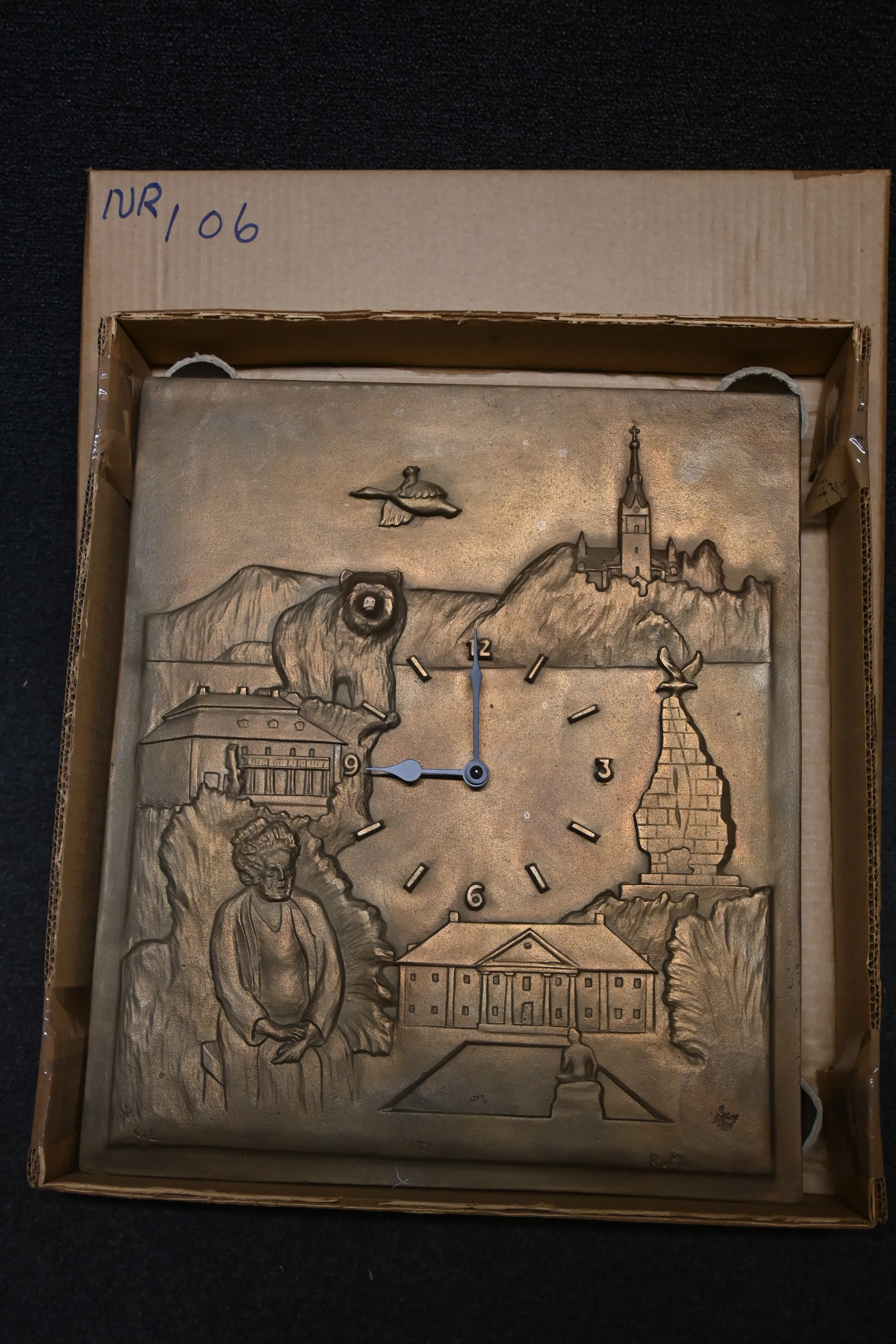 527. Fryksdalsuret är en handgjord malmrelief som är sandgjuten konstnär Sven Linnerstorp, tekniker Tord Nilsson nr.107 mått=33.5x39cm (oanvänd)529. Fryksdalsuret är en handgjord malmrelief som är sandgjuten konstnär Sven Linnerstorp, tekniker Tord Nilsson nr.68 mått=33.5x39cm (oanvänd)