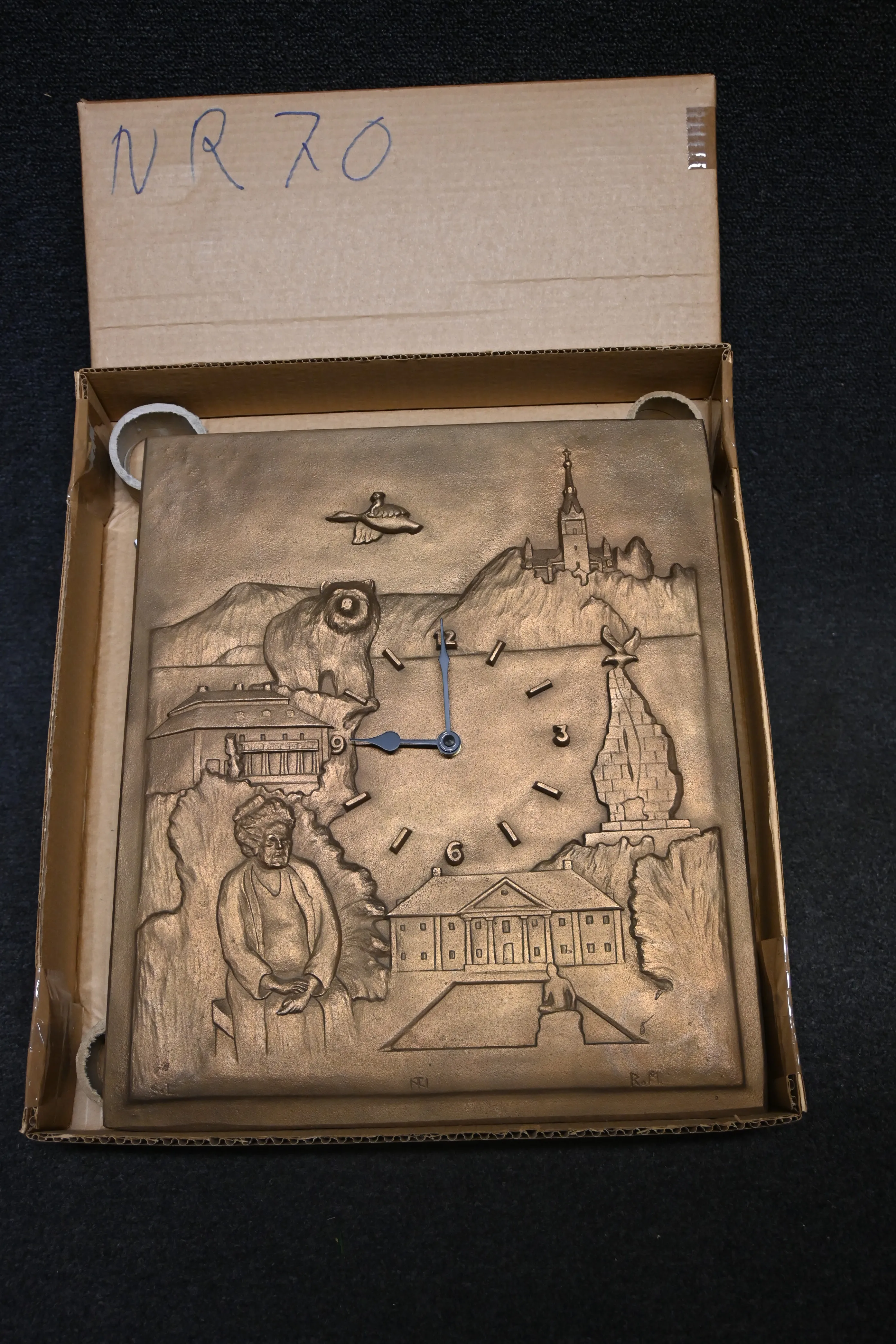 505. Fryksdalsuret är en handgjord malmrelief som är sandgjuten konstnär Sven Linnerstorp, tekniker Tord Nilsson nr.109 mått=33.5x39cm (oanvänd)507. Fryksdalsuret är en handgjord malmrelief som är sandgjuten konstnär Sven Linnerstorp, tekniker Tord Nilsson nr.69 mått=33.5x39cm (oanvänd)