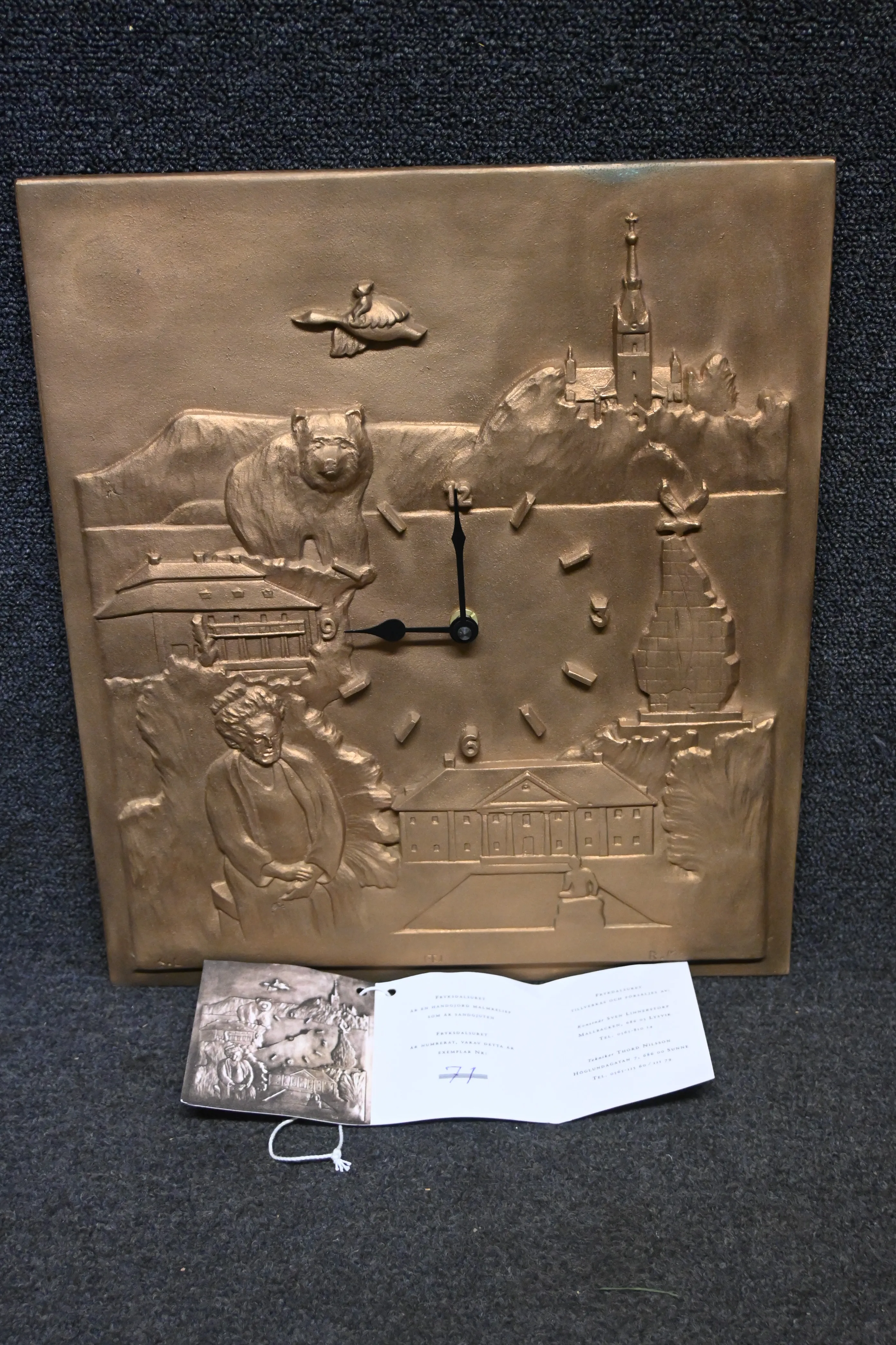 493. Fryksdalsuret är en handgjord malmrelief som är sandgjuten konstnär Sven Linnerstorp, tekniker Tord Nilsson nr.69 mått=33.5x39cm (oanvänd)