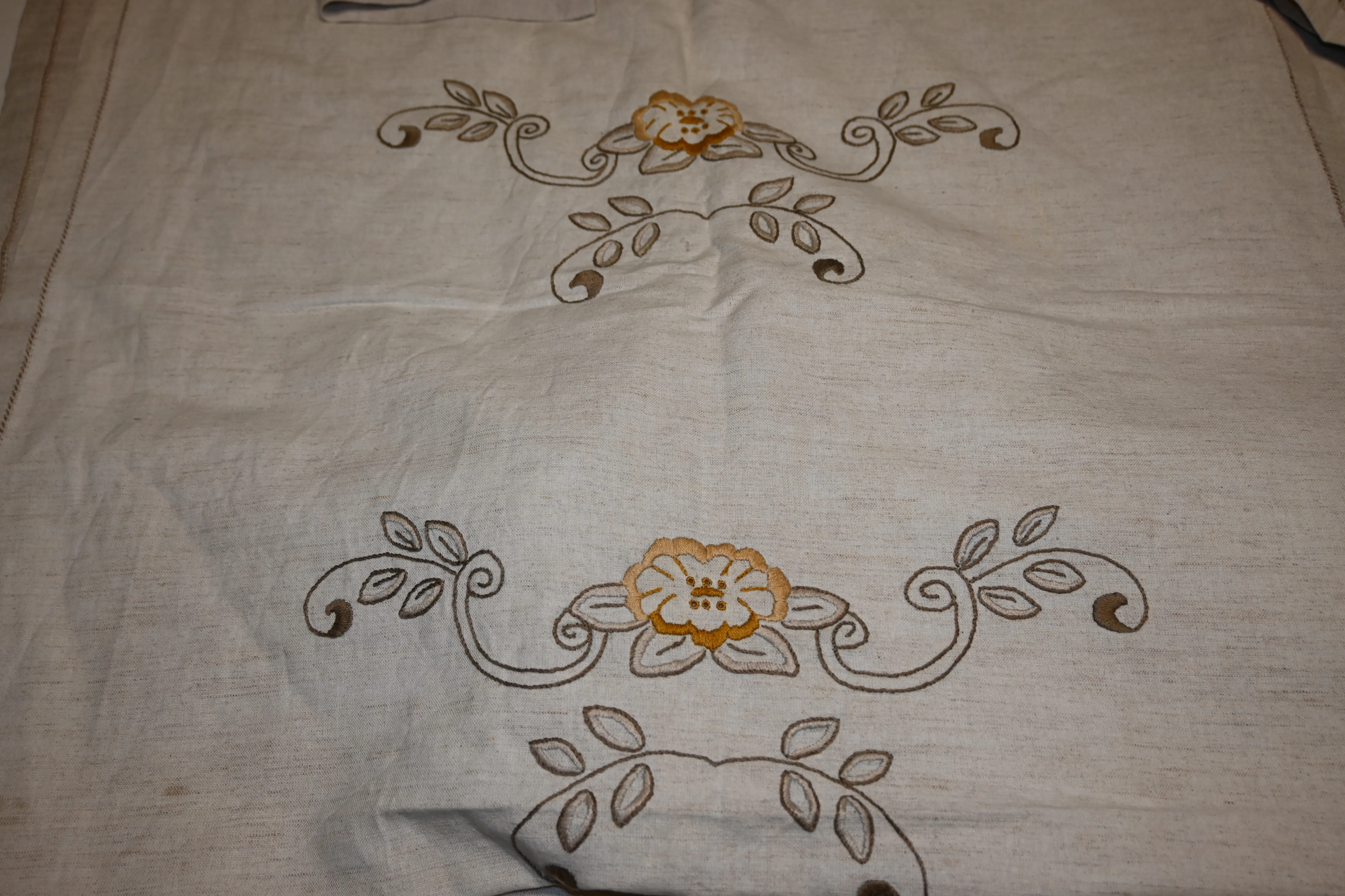 619. Gardiner 2par 68x210cm, 2st gardinkappor hemvävda med broderi