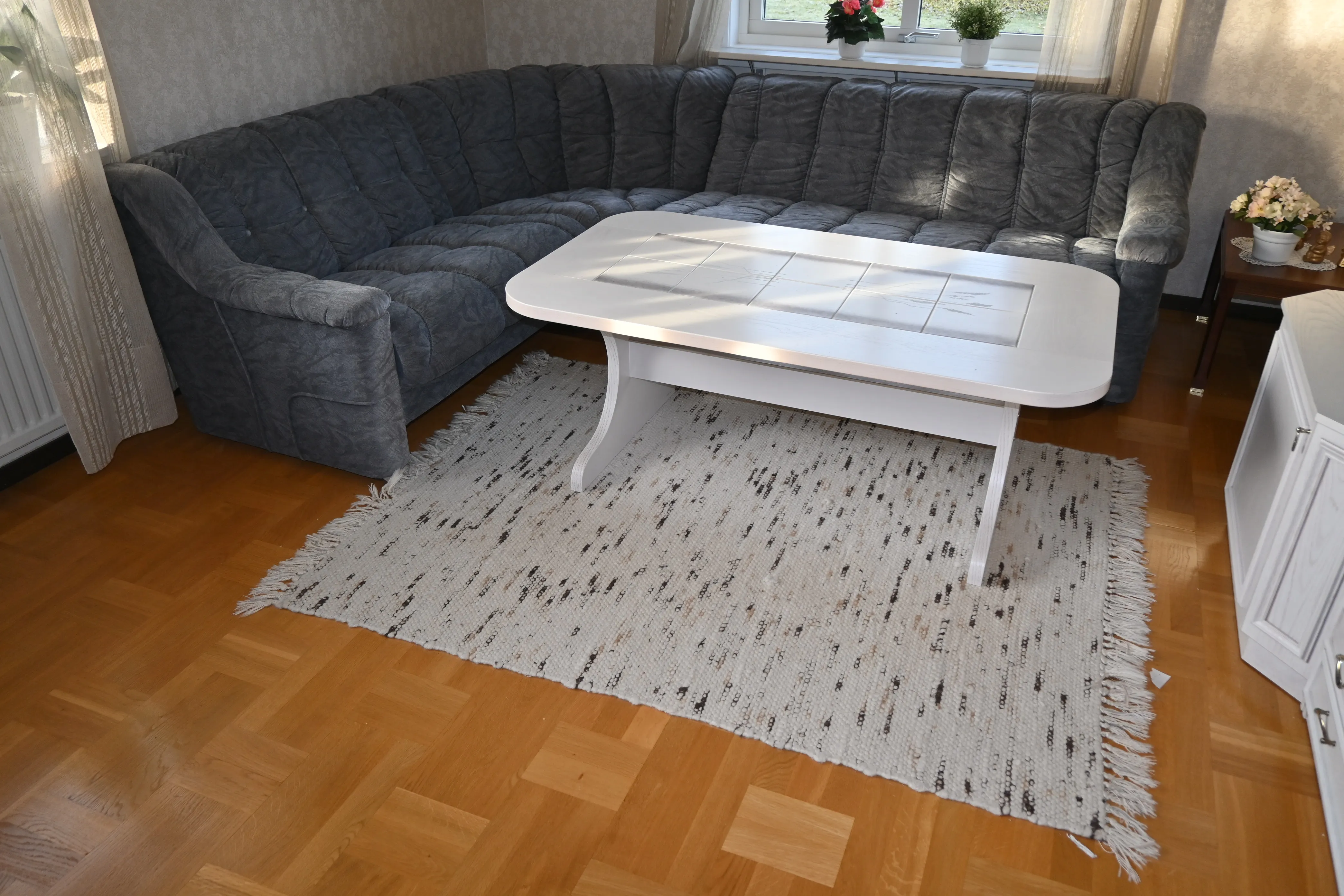 746. Hörnsoffa 210x265cm + soffbord & matta (bruksslitage)