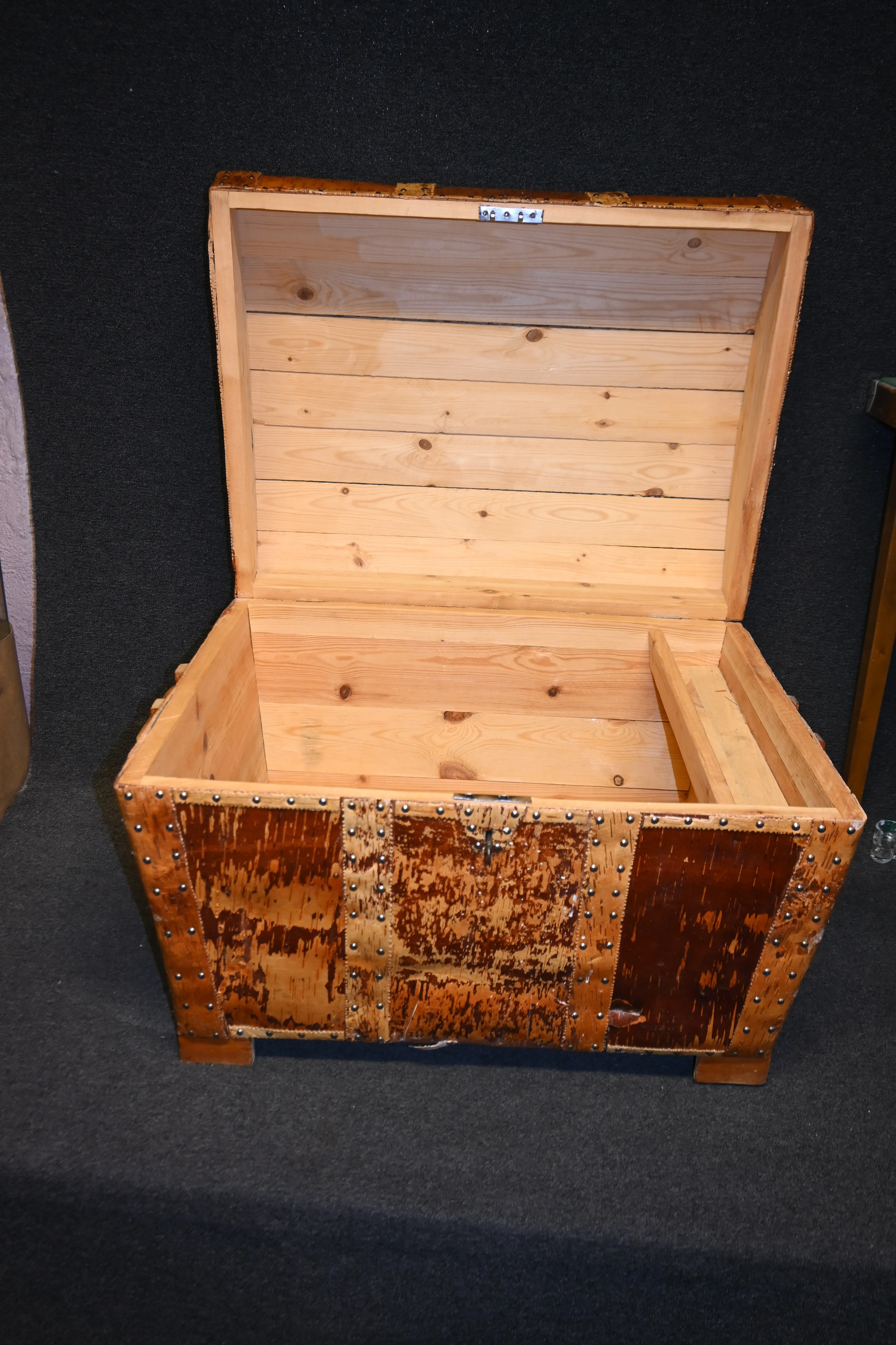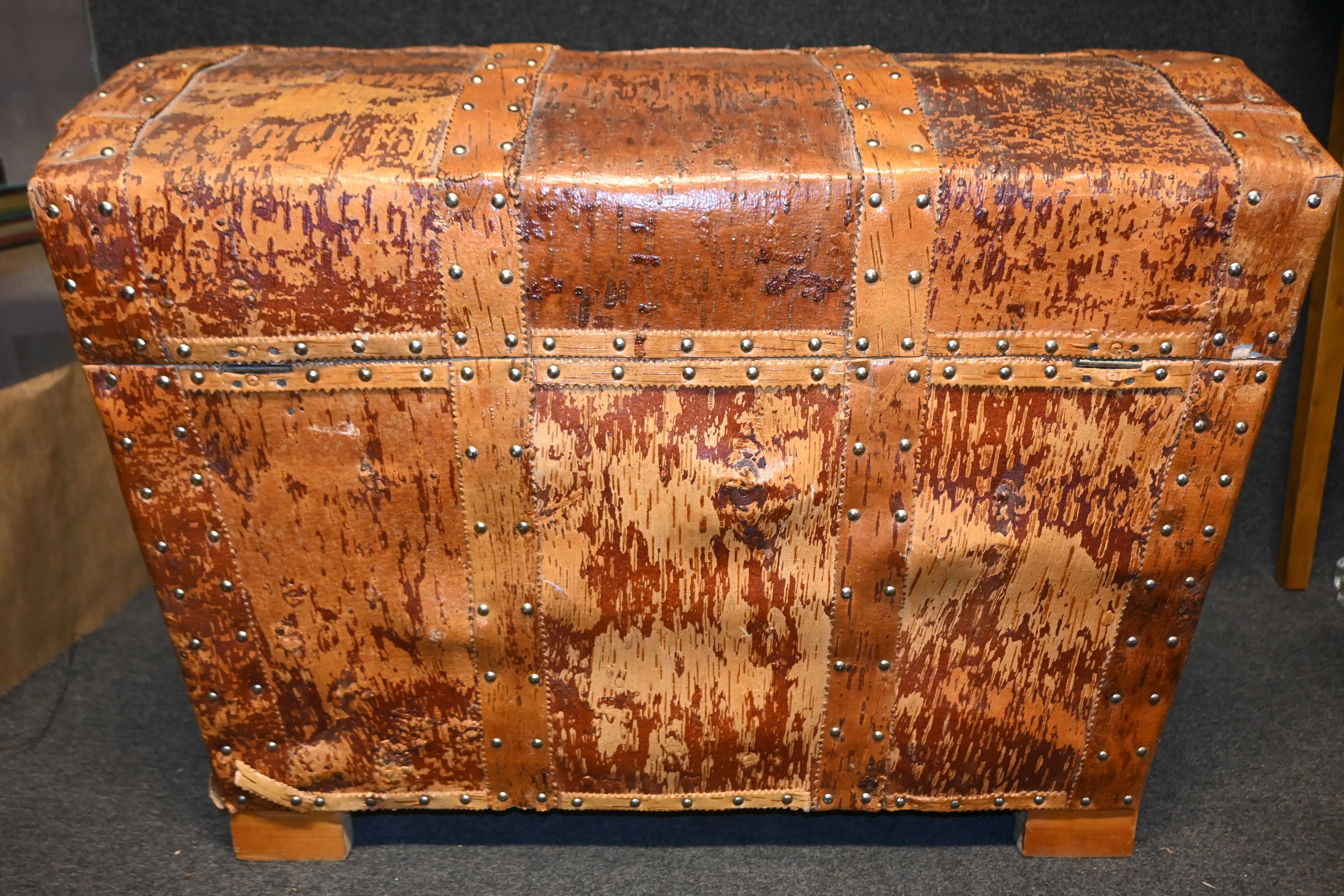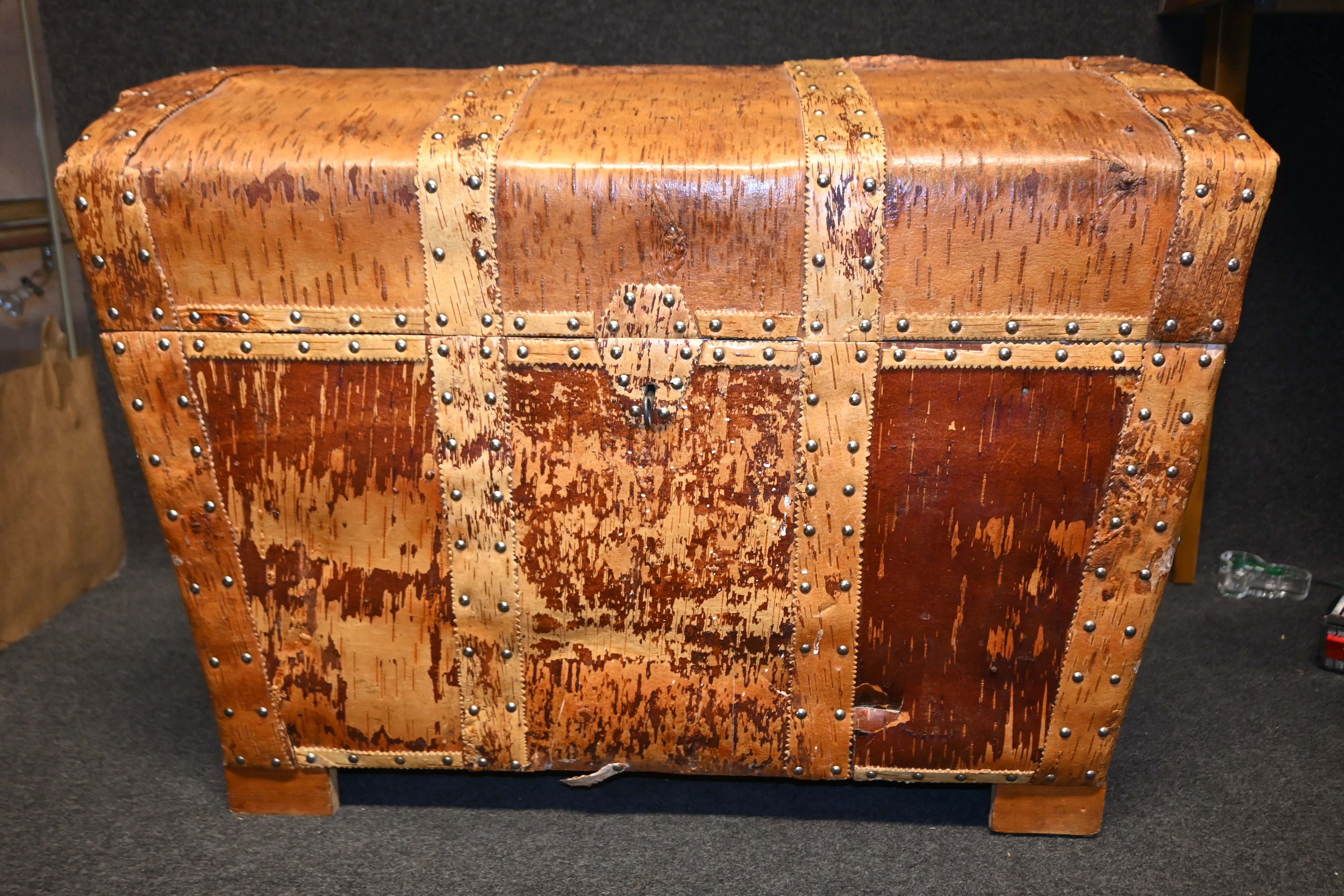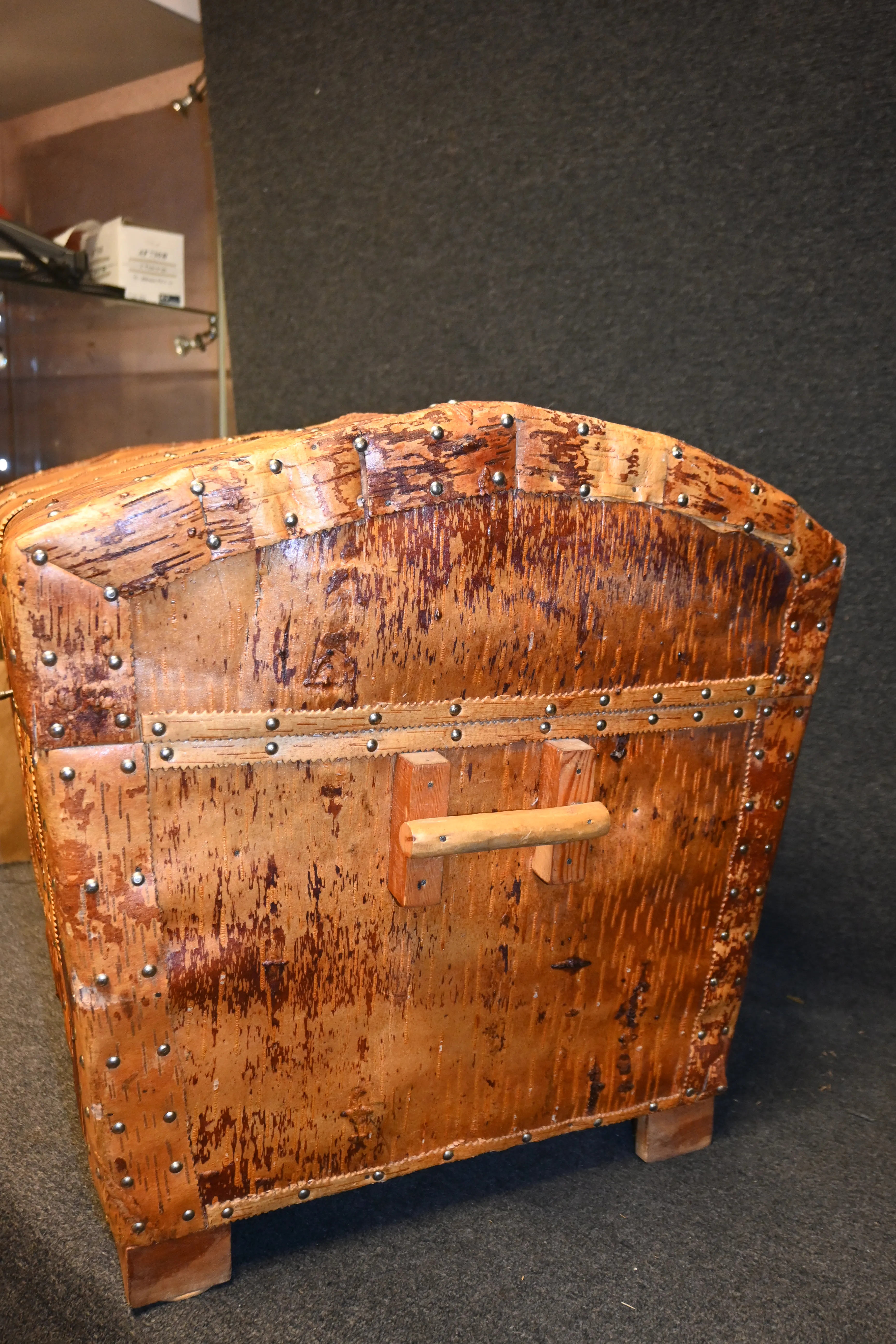 Handgjord kista i trä med dekor av näver L.72cm H.57cm D.53cm