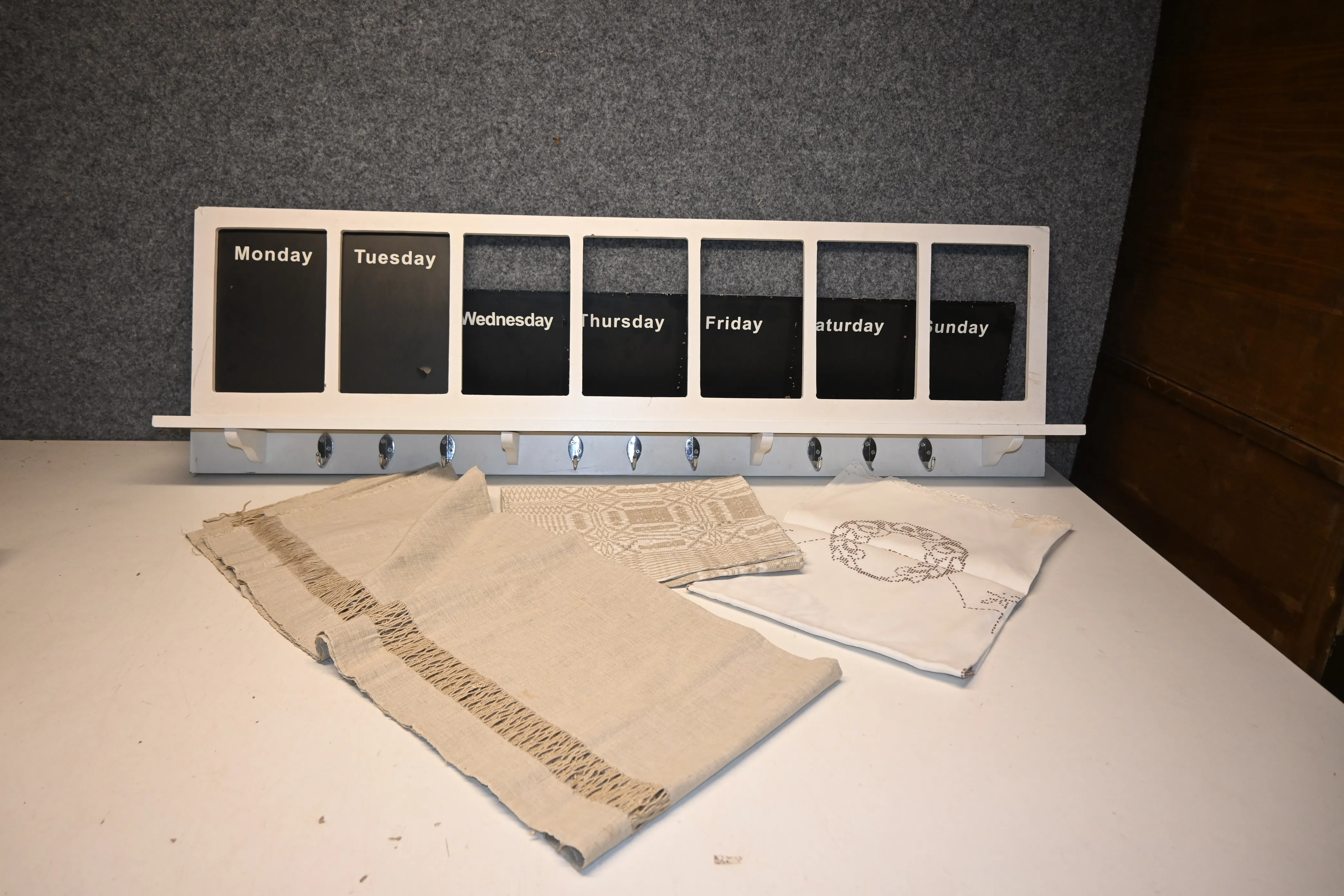 Hatthylla (bruksslitge, märken) + 3st dukar (fläckar förekommer)