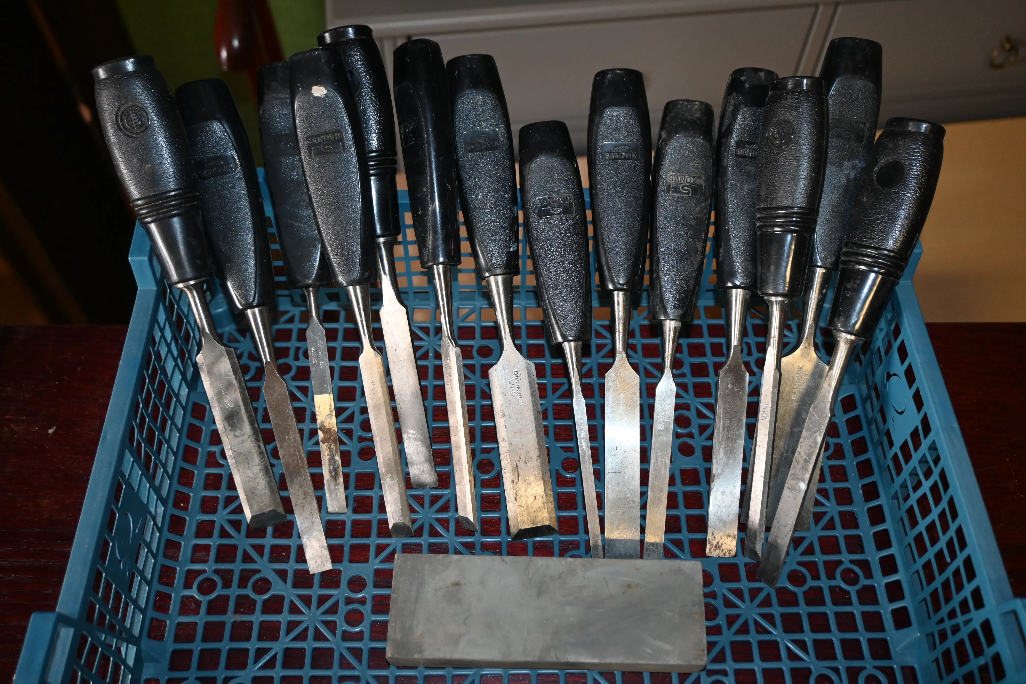543. Parti div verktyg, stiftapparat, huggmejslar m.m