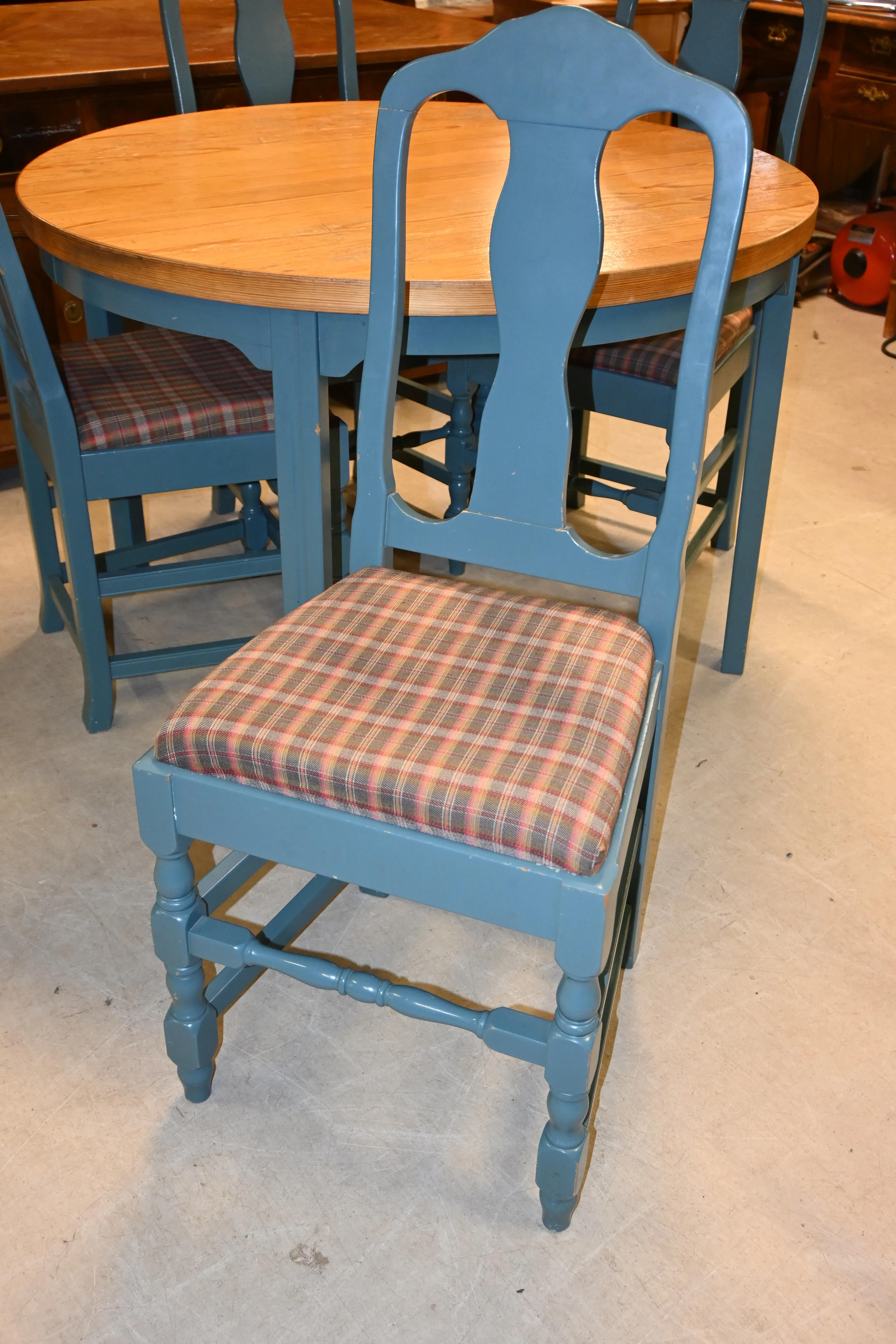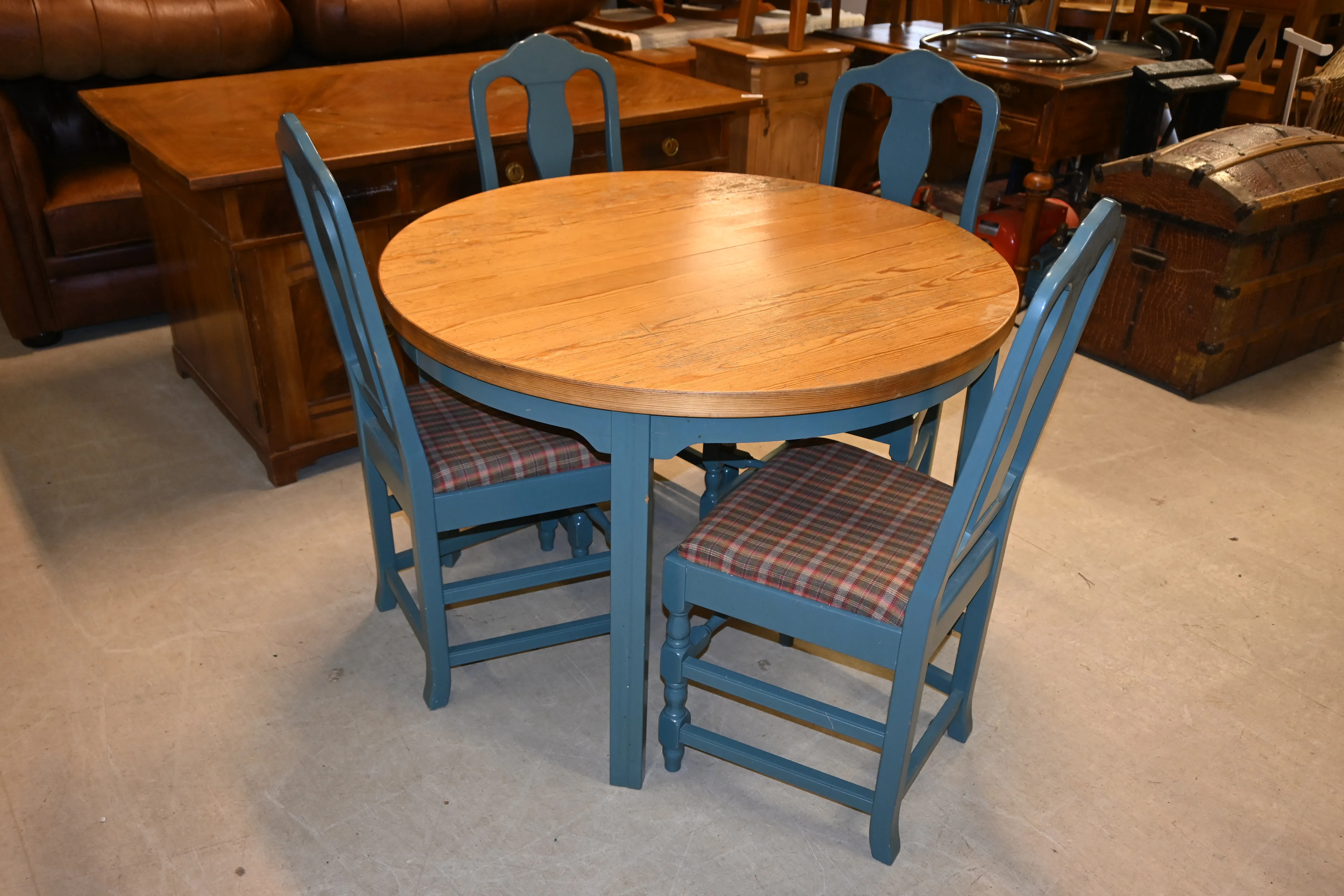 359. Köksbord H.74.5cm D.110cm + 4st stolar (slitage på skivan)