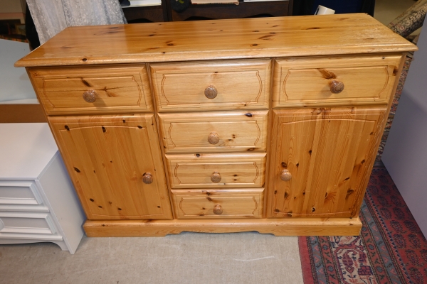 202. Köpmansdisk i i fura H.90cm B.130cm Dj.43cm (slitage)