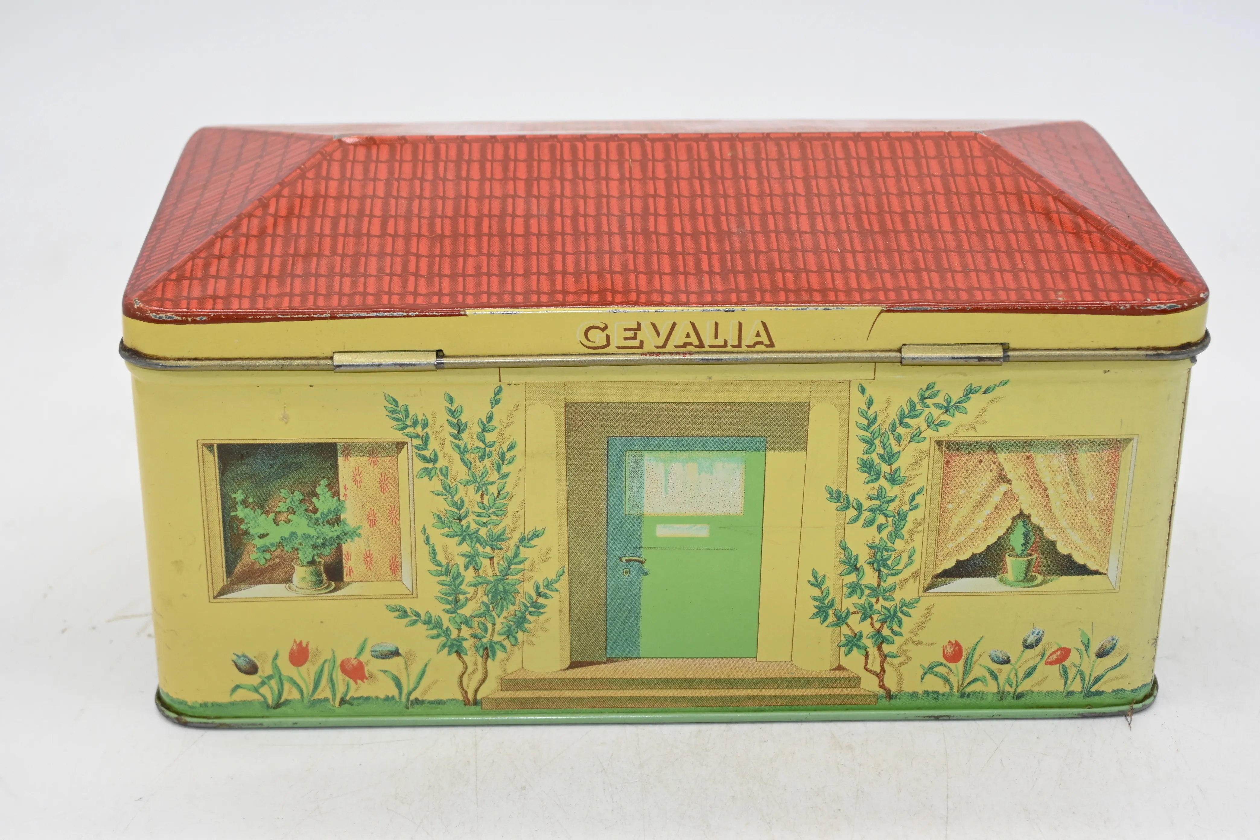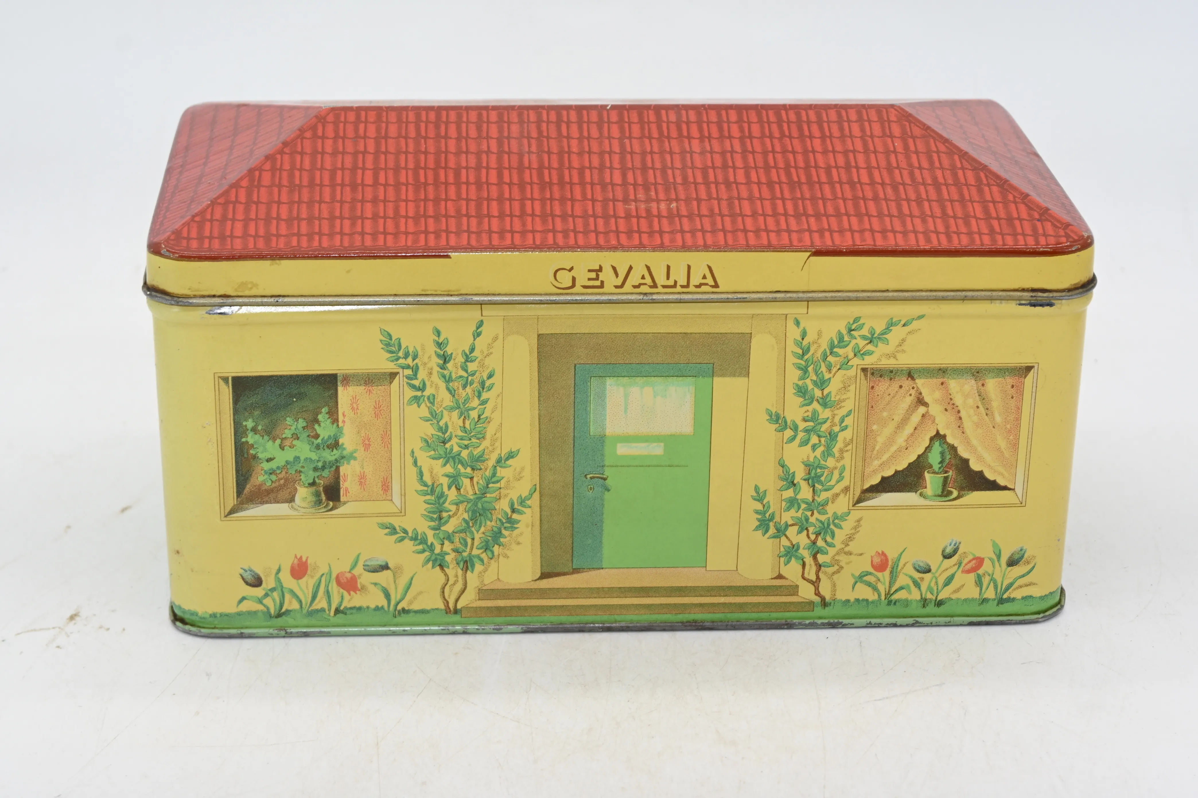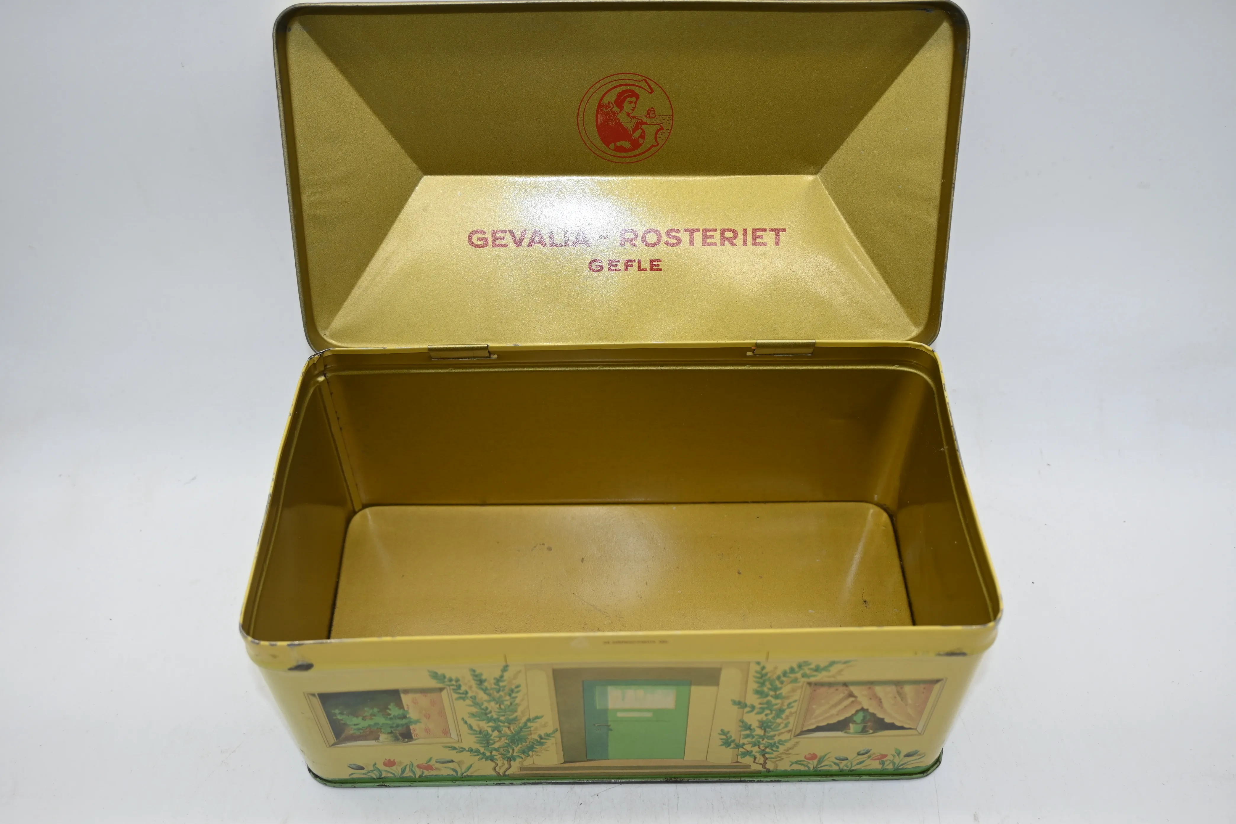 22. Kaffeburk i plåt, Gevalia-Rosteriet Gefle L.23.5cm H.12cm (i bra bruksskick)