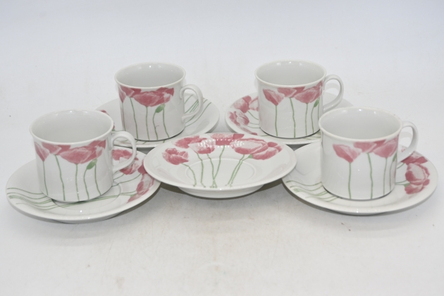 336. Kaffekoppar med fat 4st + fat, Rörstrand "Vallmo"