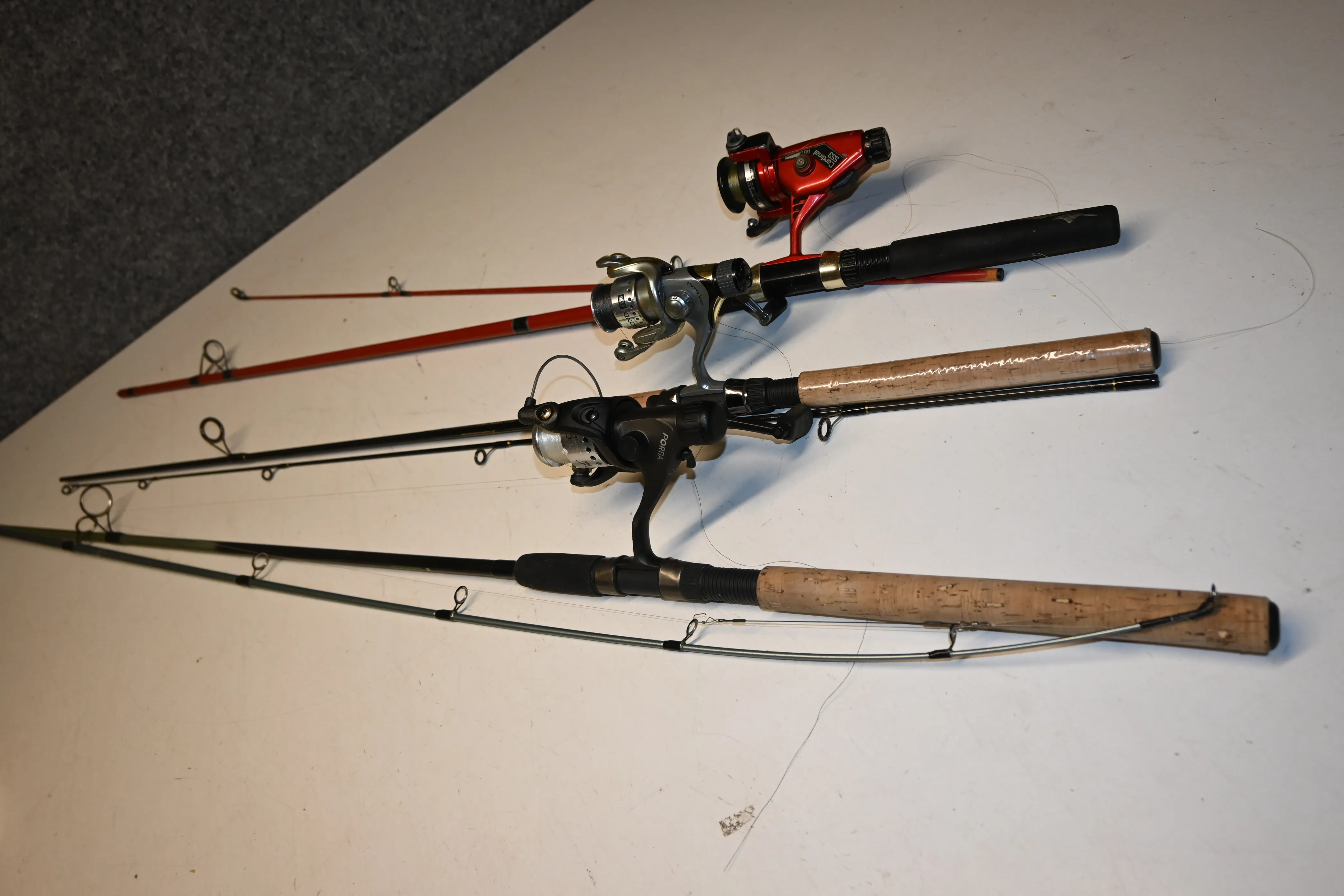 527. Kastspö 3st, Salmo suprem carboxy (oanvänd) rulle Diamond, Falcon X-strong m rulle Portia MG2000R, spö m rulle Abu Cardnial 553