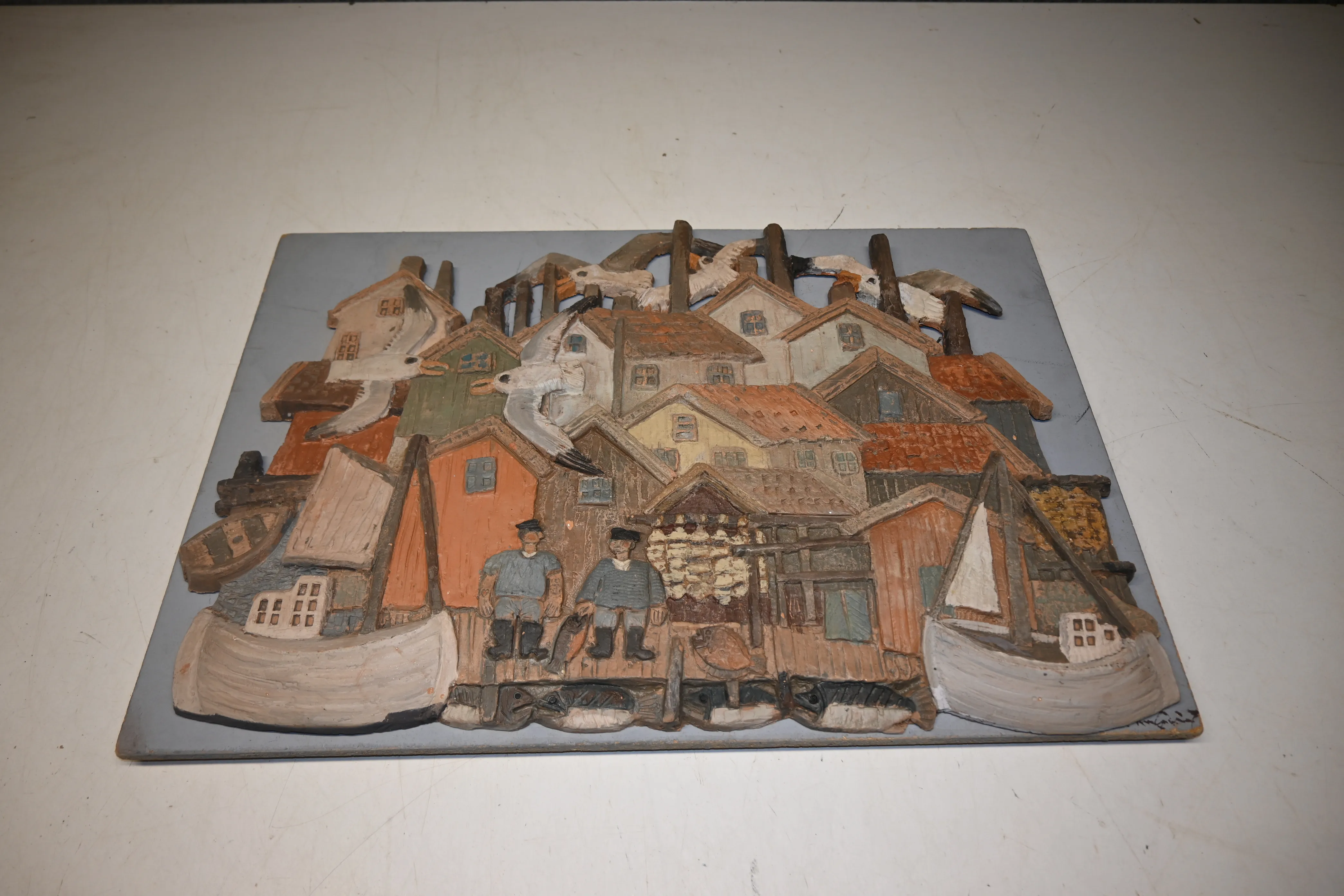 354. Keramik tavla på spånplatta "Fiskehamn" av Bengt Lindqvist mått 64x44cm (små nagg)