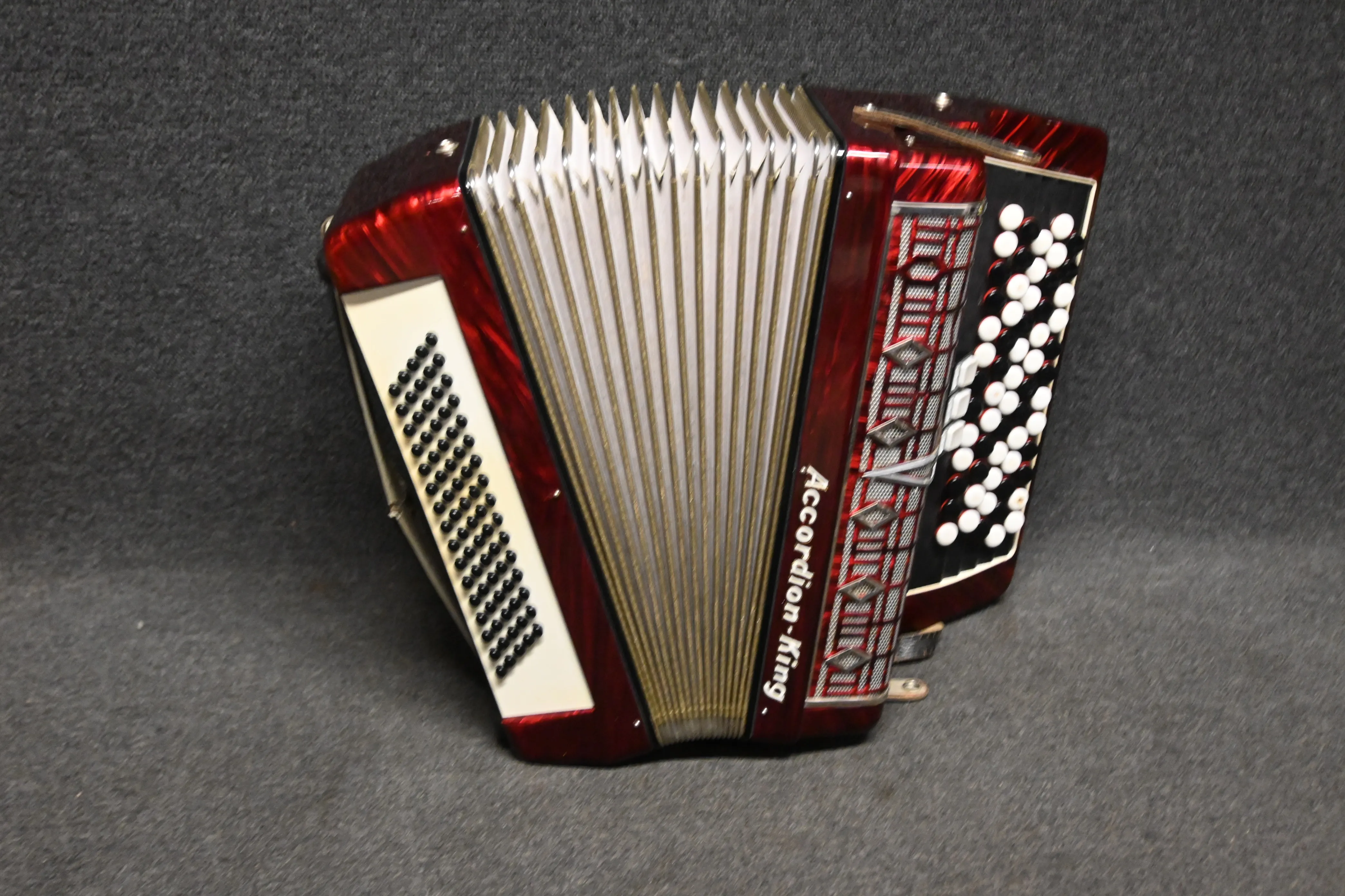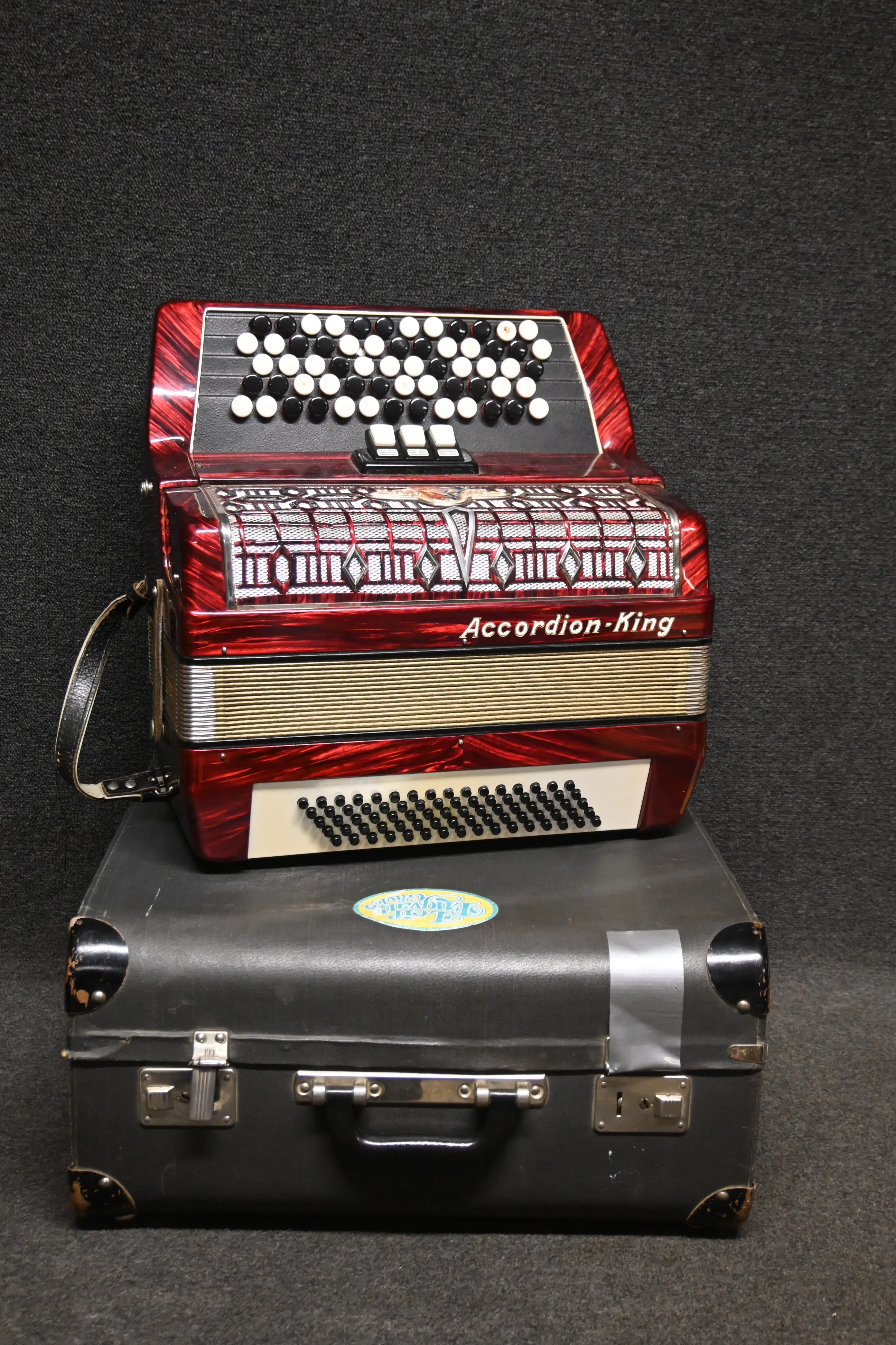 113. Knappdragspel, Accordion-King med låda (ngt märke förekommer, färgsläpp, slitage på lådan )