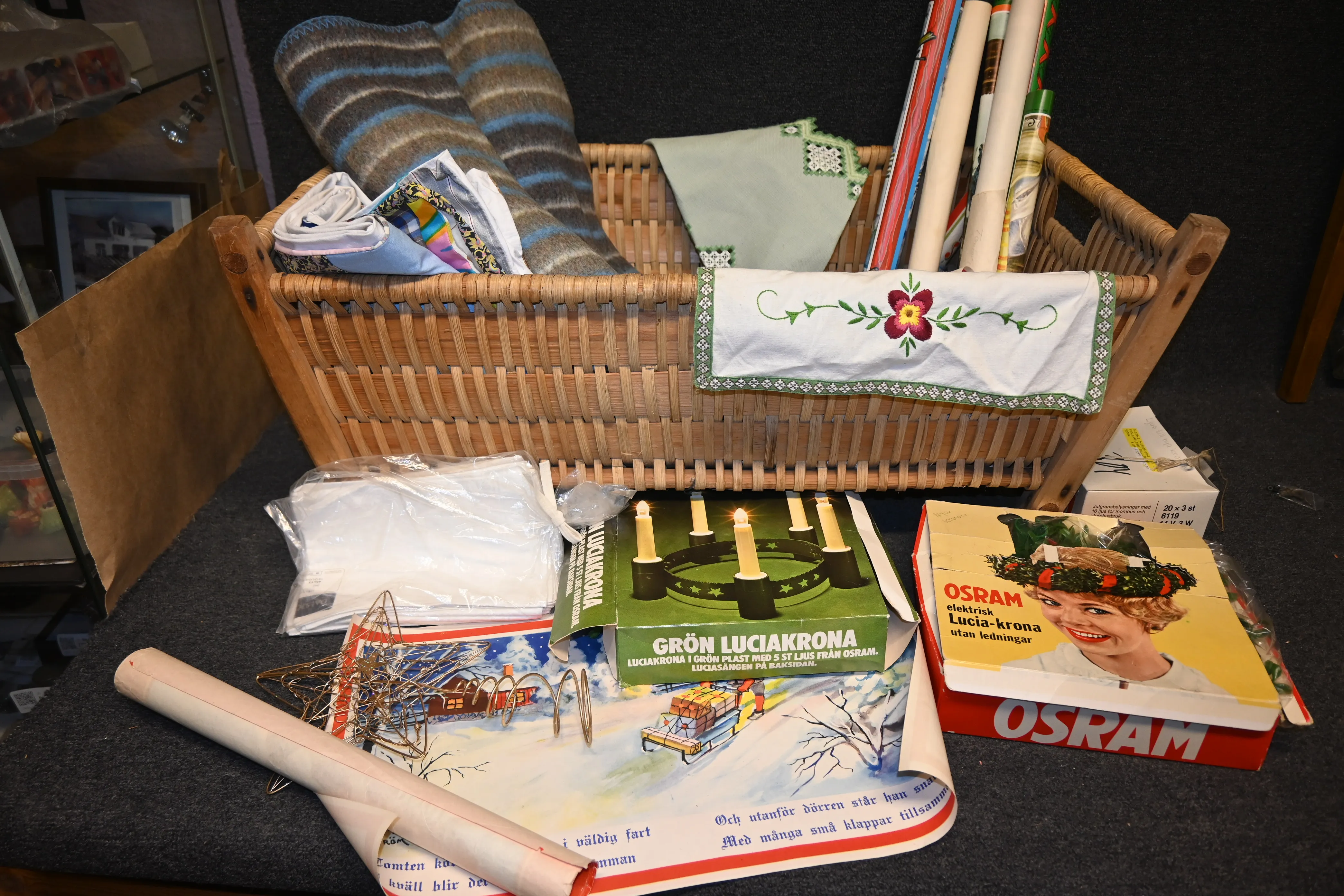 Korg med yllefilt , pappersbonader linneservetter mm