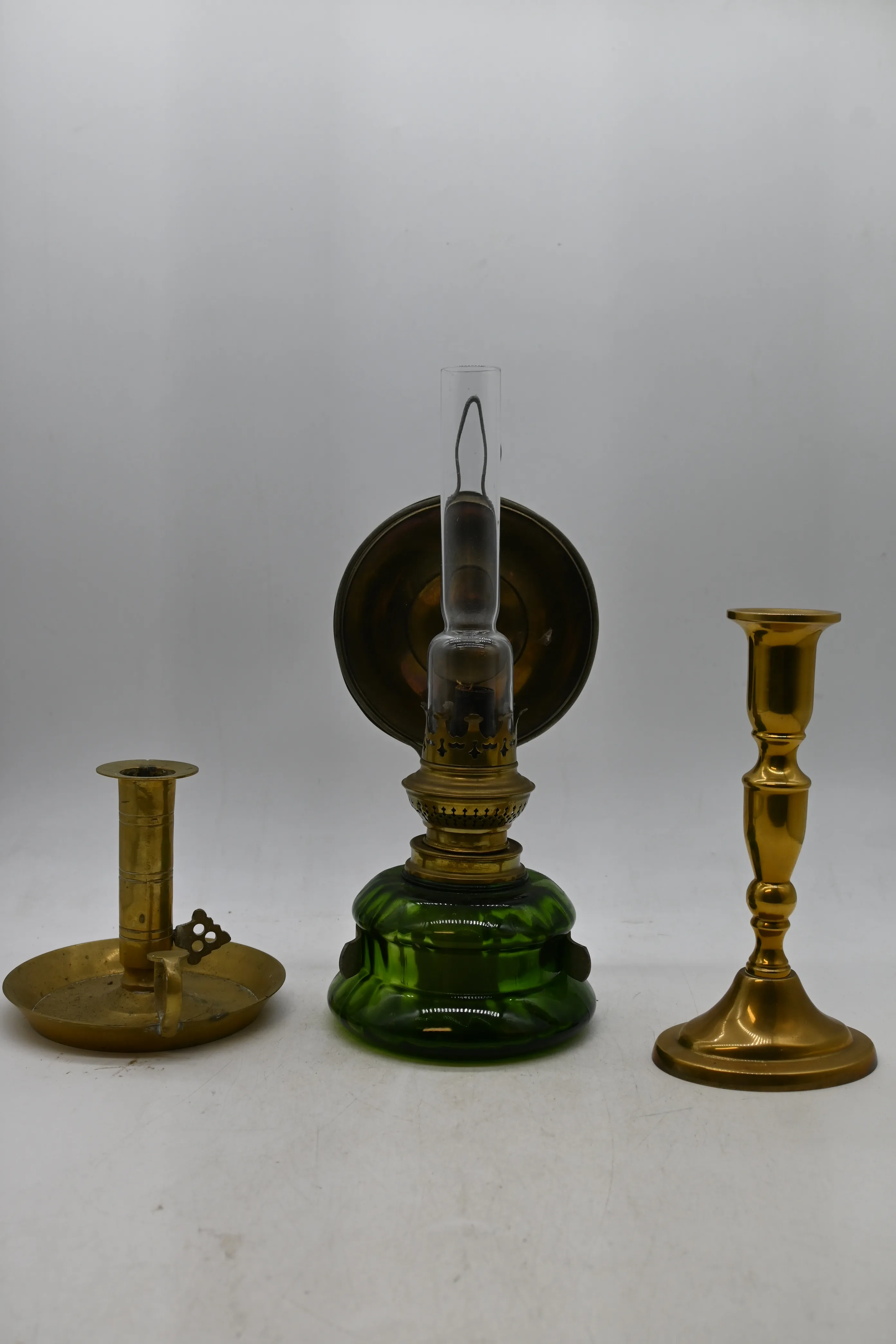 Ljusstakar i mässing + väggfotogenlampa (ej rätt linjeglas)