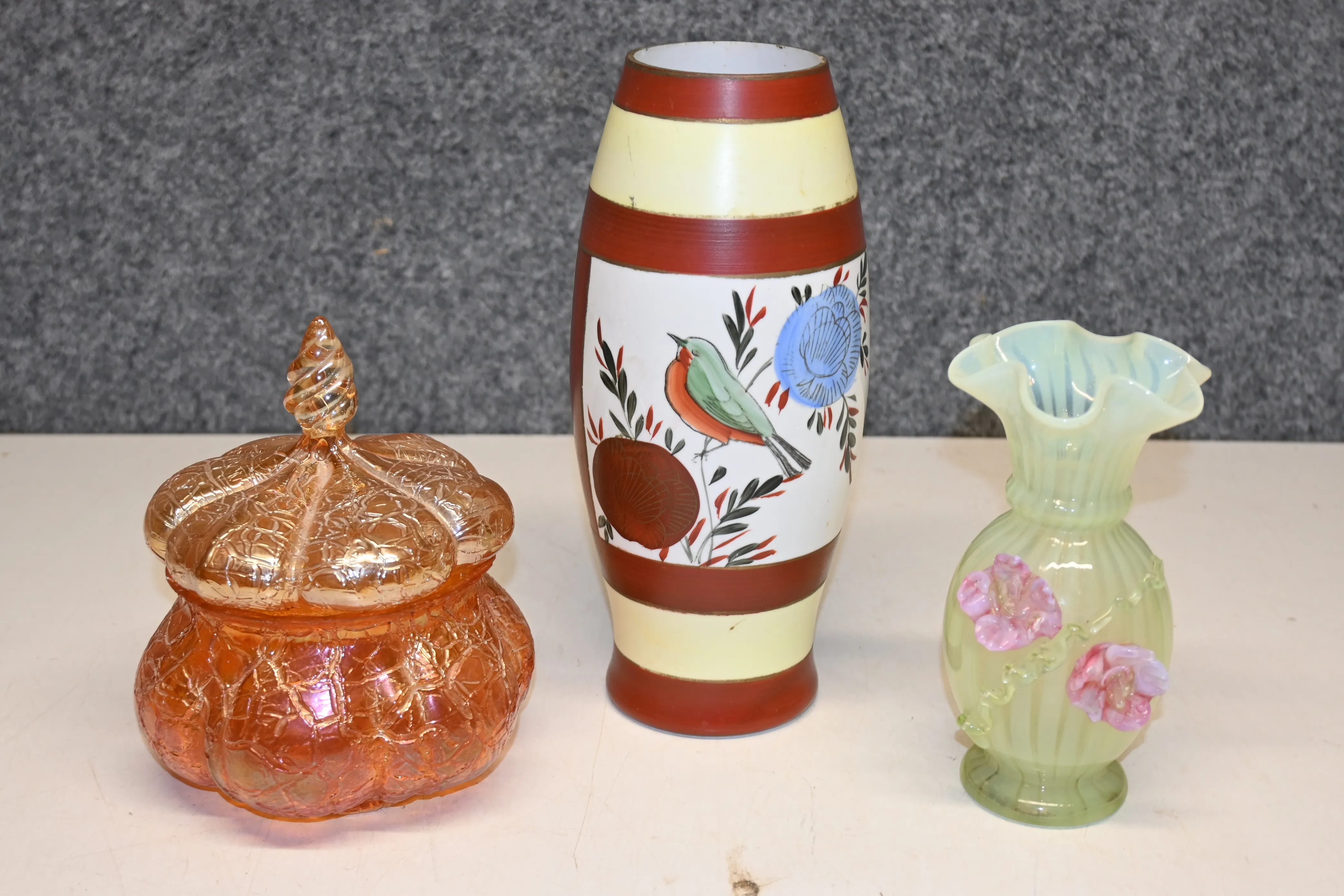 566. Lockskål i konstglas (nagg förekommer), flussvas med målning, vas i konstglas