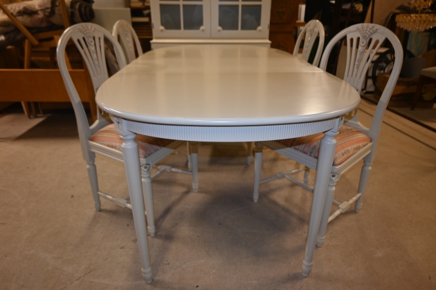 472. Matsalsbord 1st ilägg + 4st stolar Gustaviansk stil Axet L.140-188cm B.100cm H.74cm (bruksslitage)