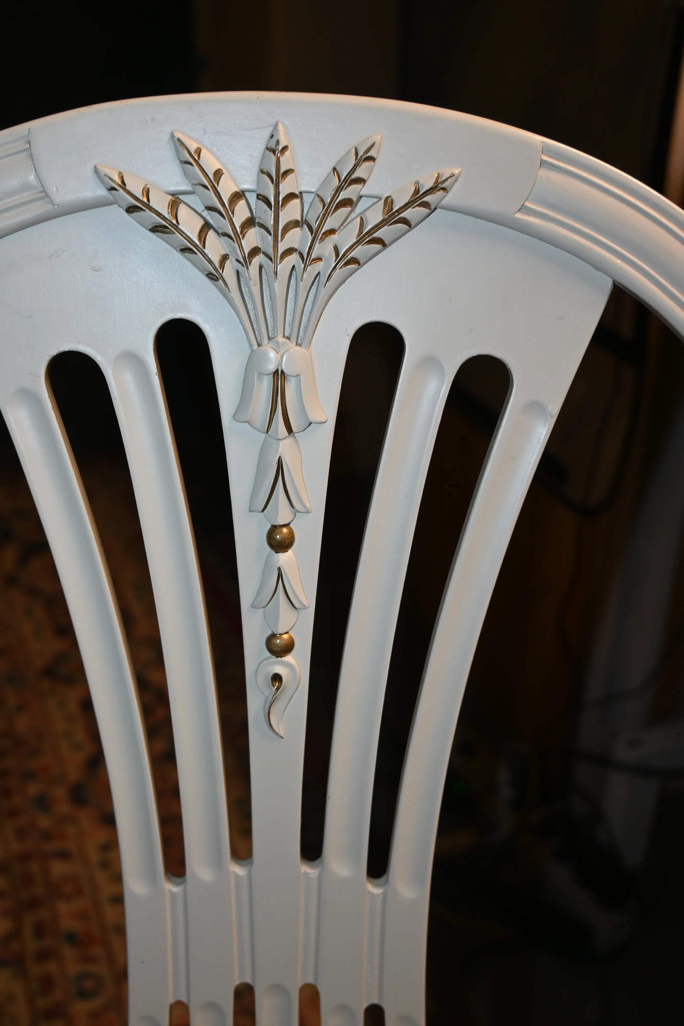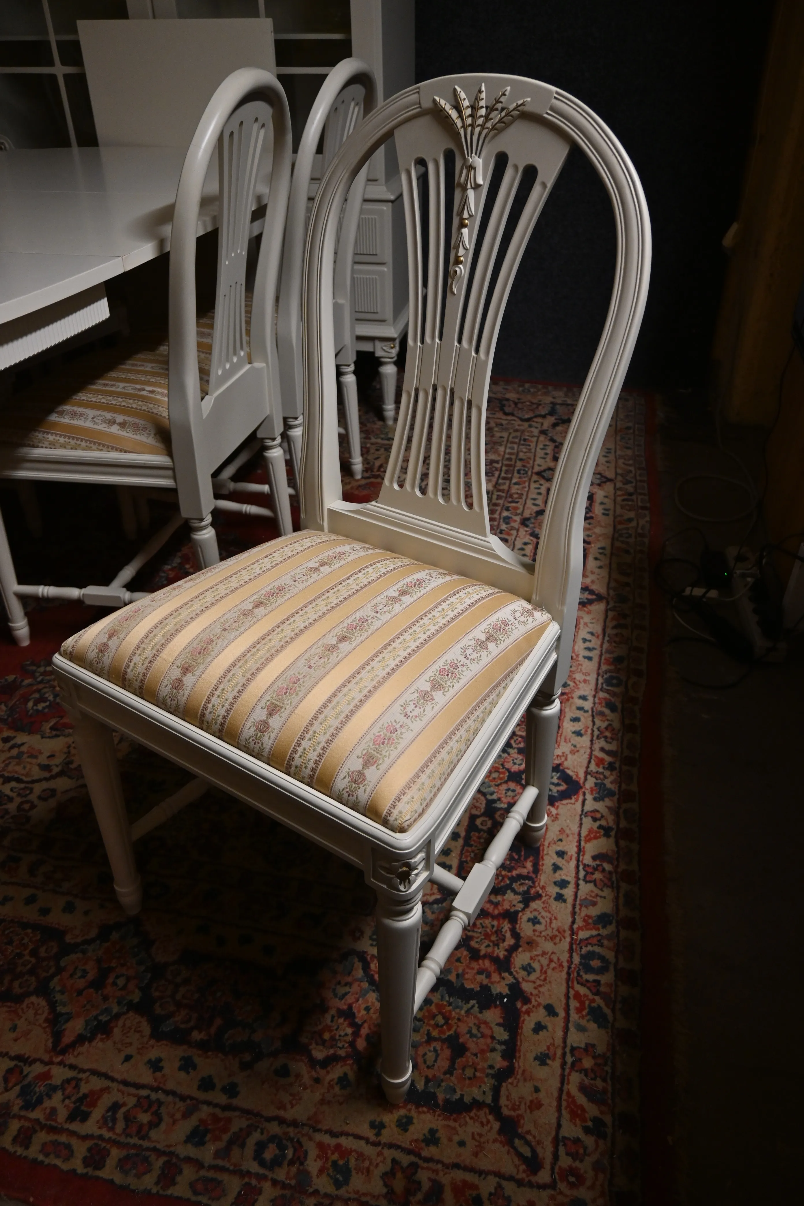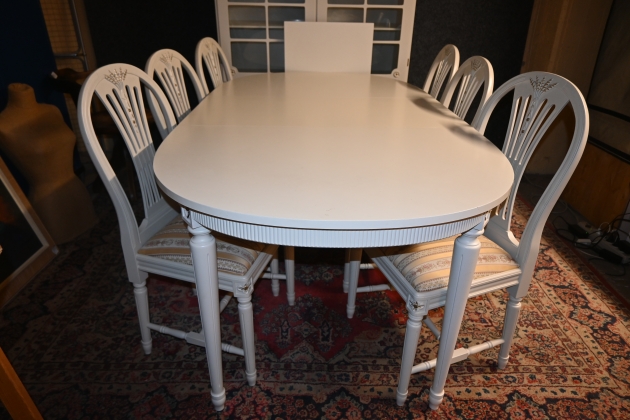 102. Matsalsbord 2st ilägg + 6st stolar Axet i Gustaviansk stil (bruksslitage) L.230cm med ilägg B.100cm H.75cm