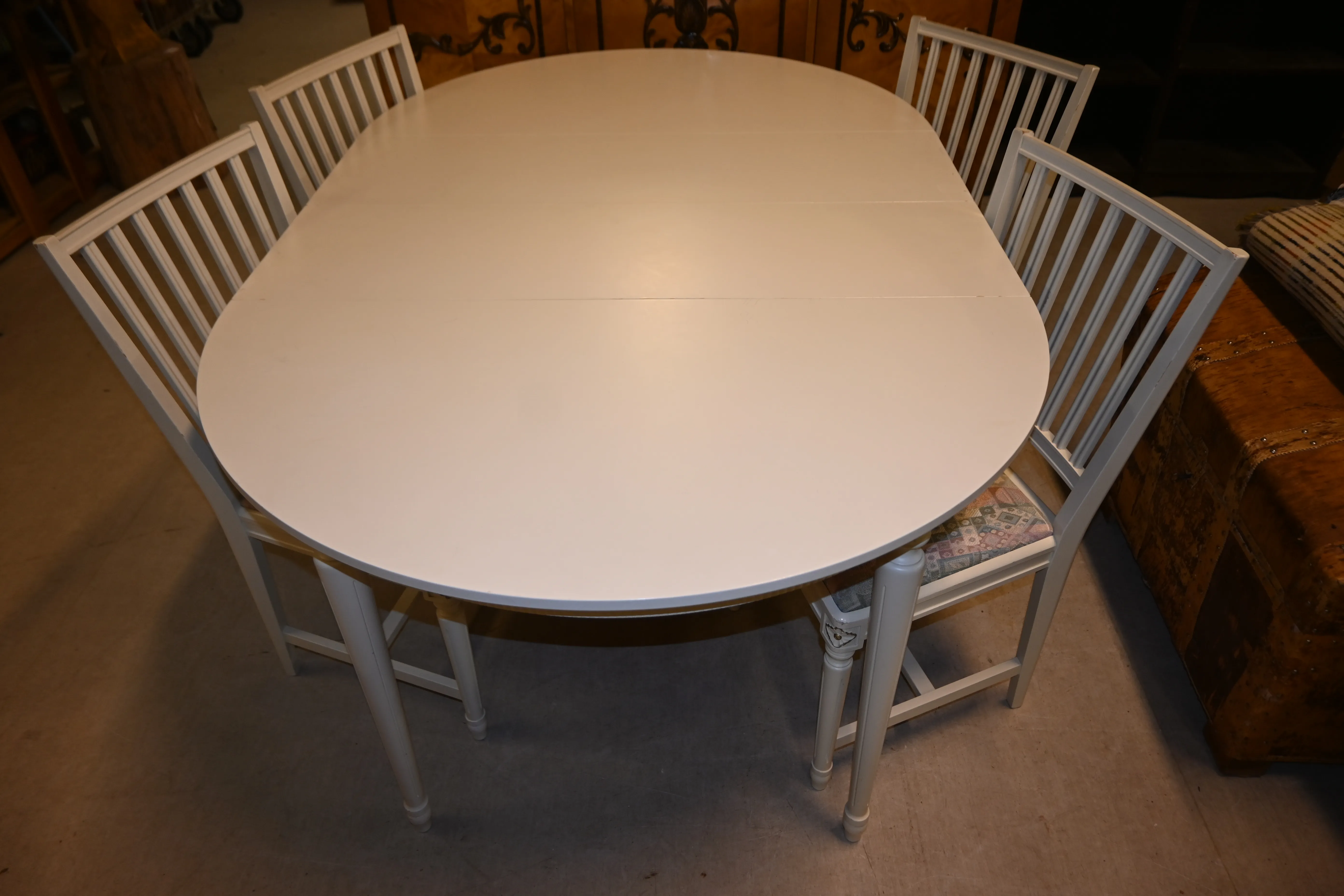 712. Matsalsbord 2st ilägg L.105-165cm B.105cm H.74cm + 4st stolar i Gustaviansk stil (bruksslitage)
