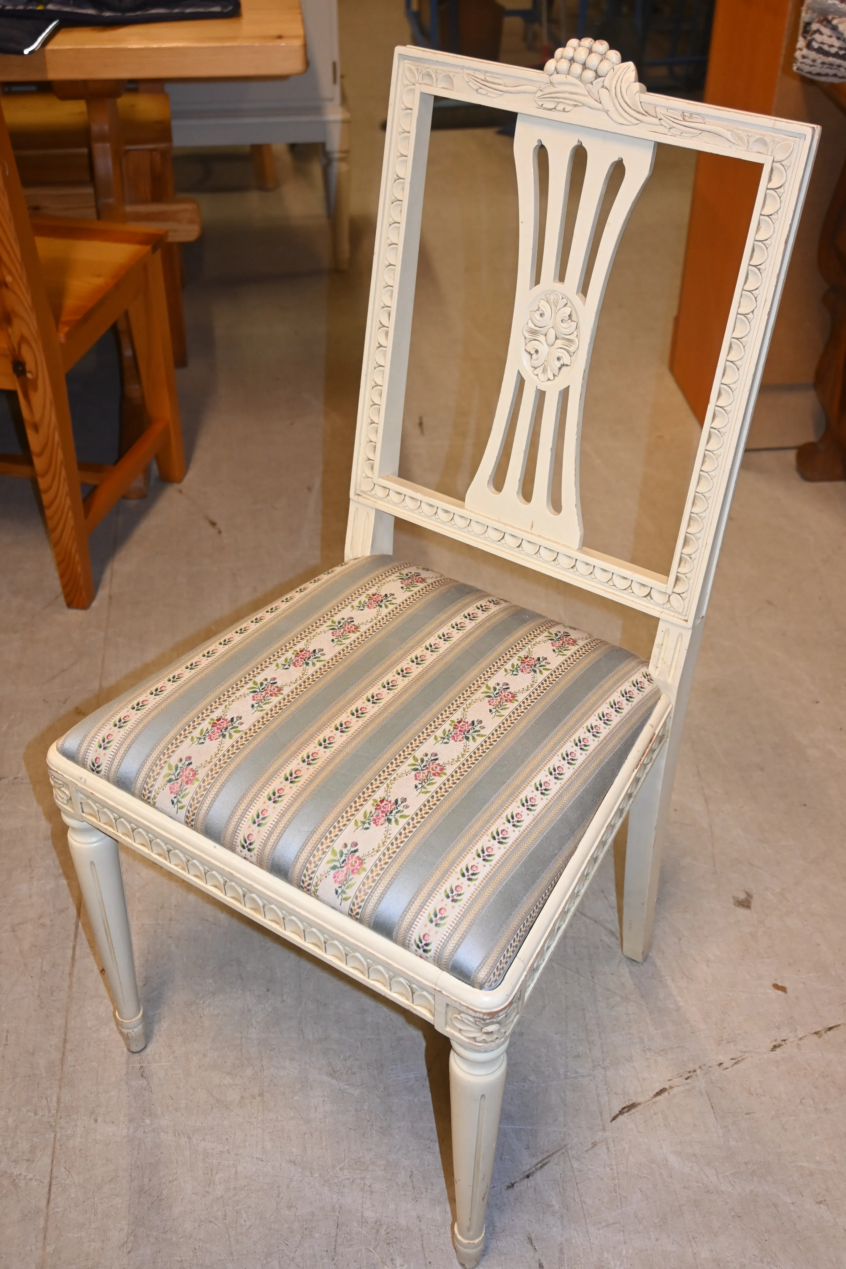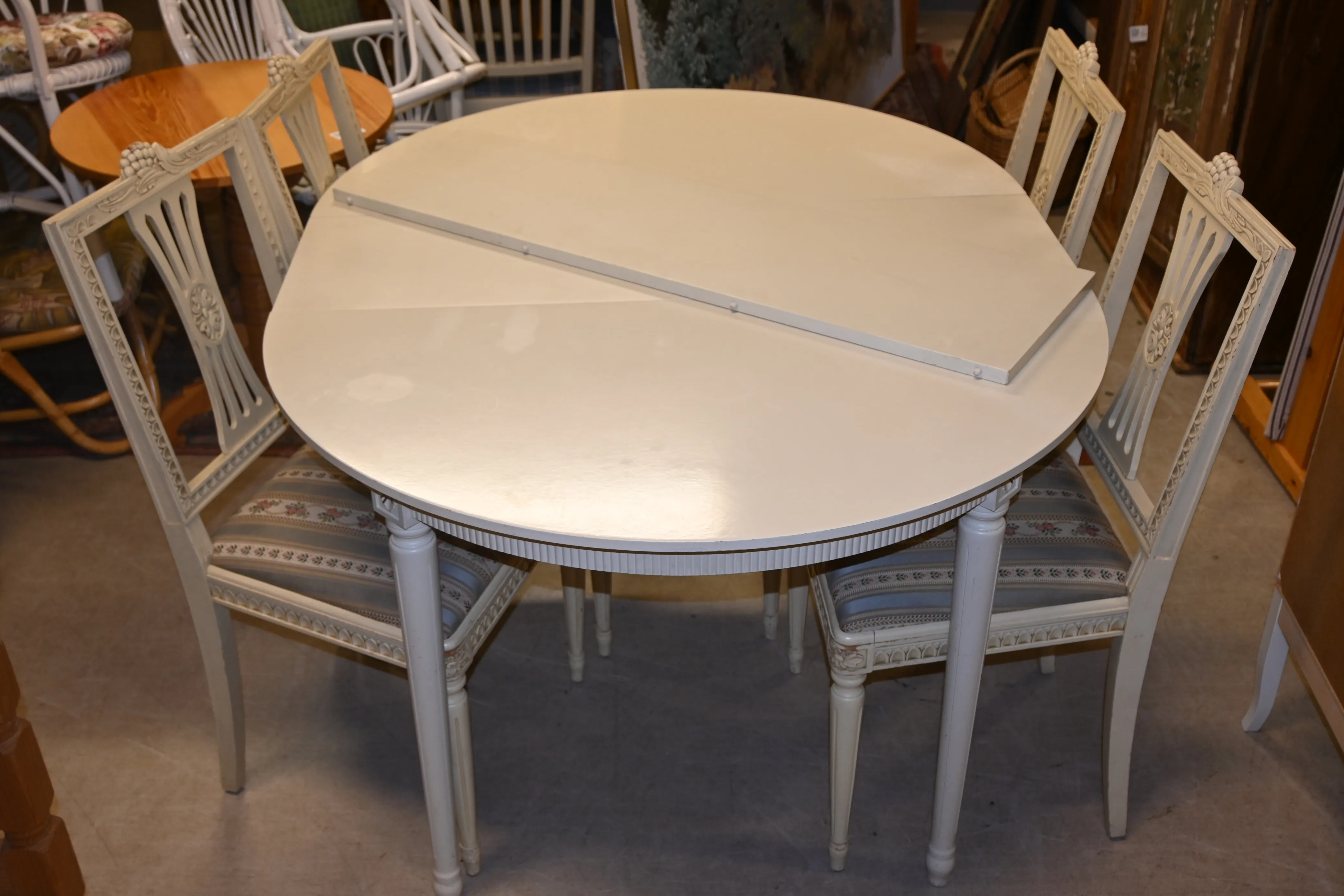 Matsalsbord 2st ilägg 4st stolar, Gustaviansk stil "Druvan" L.165cm ink ilägg H.73.5cm B.105.5c,´m (färgslitage)