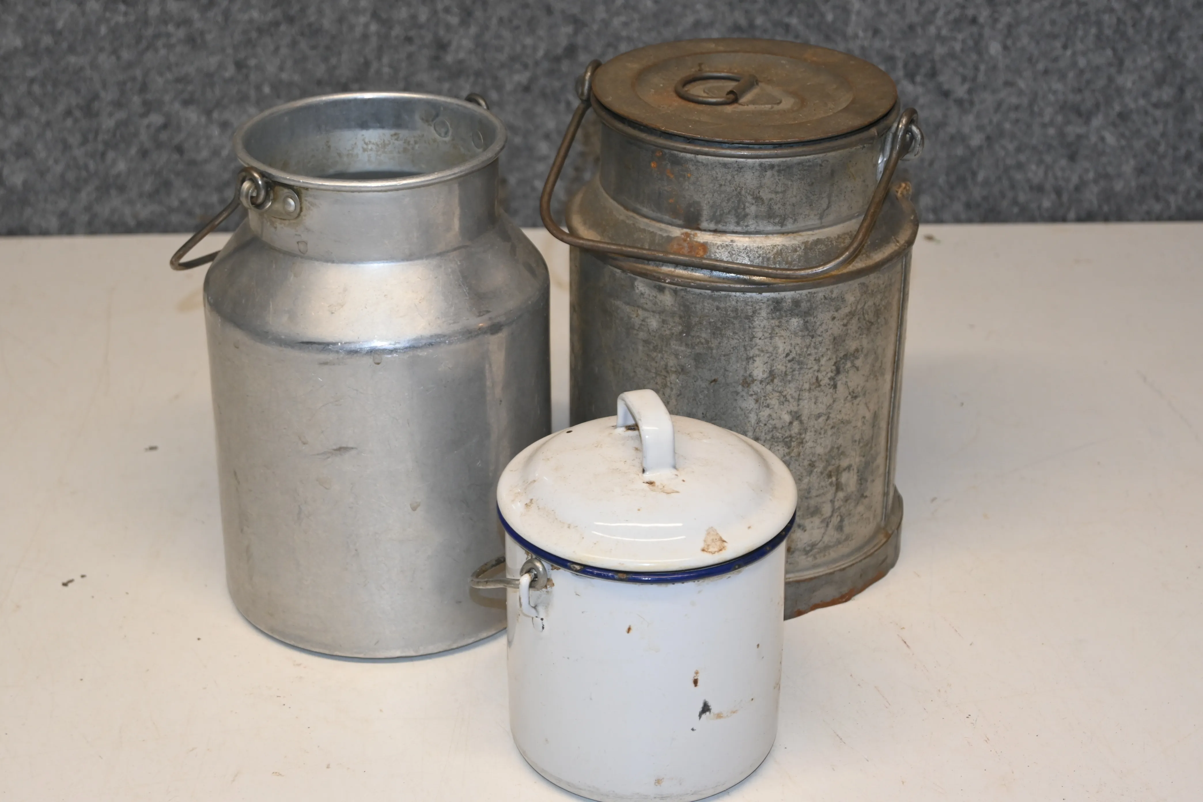 Mjölkkannor 2st (1 lock saknas) + gräddhämtare emaljerad