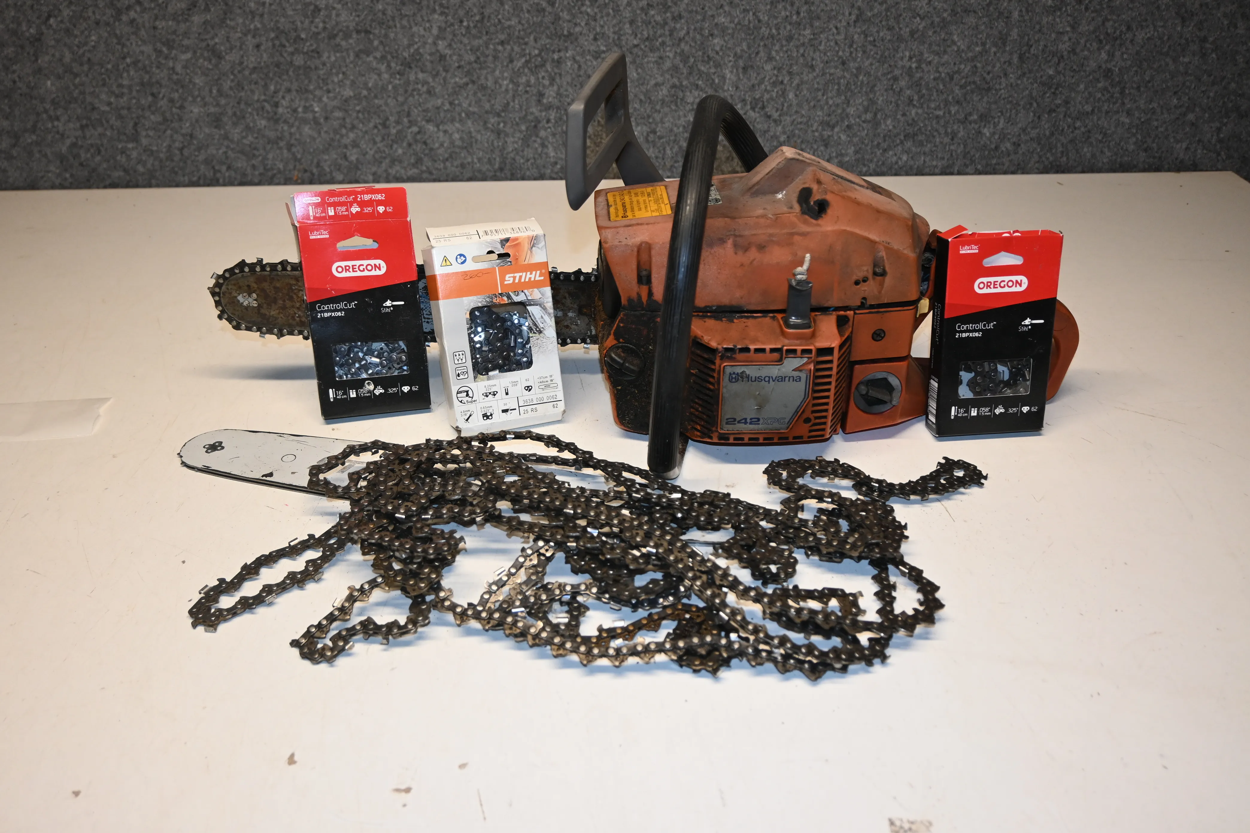 511. Motorsåg Husqvarna 242 XP (inga garantier ) samt kedjor och svärd