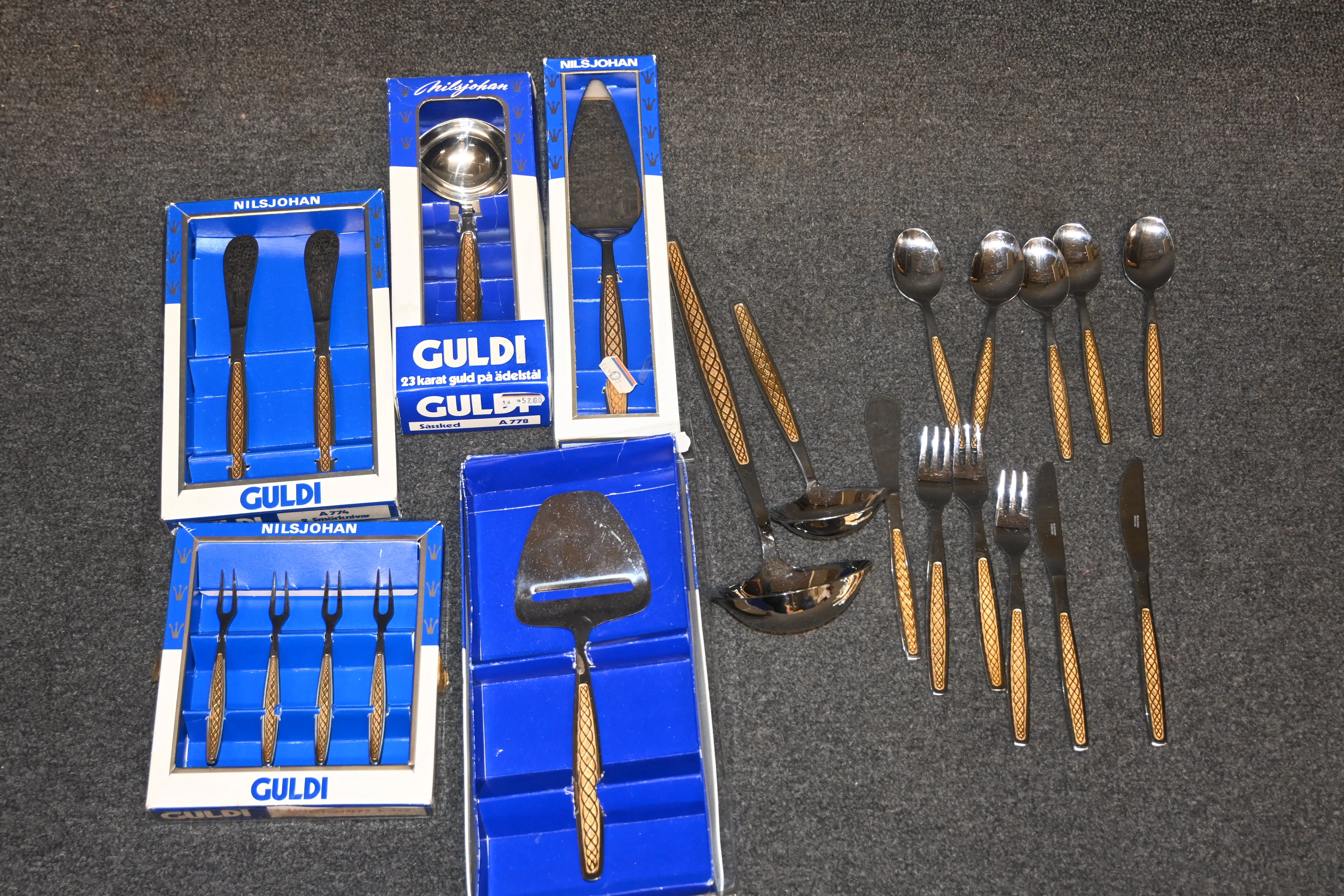 Såsskedar 3st, smörknivar 3st, Tårtspade, Osthyvel, assiettgaflar 4st, dessertskedar 5st, smörgåsgafflar 3st, smörgåsknivar 2st