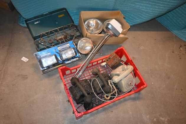 Parti äldre telefoner, extra ljus, gasolkök m.m