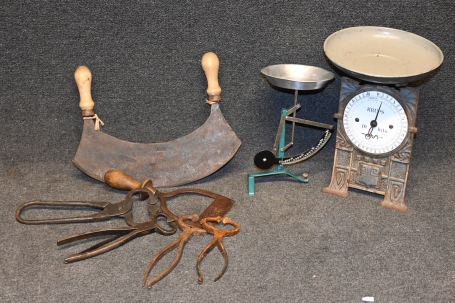 Parti allmogeverktyg, hushållsvågar bl a i gjutjärn (def)