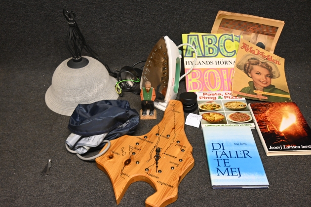 Parti böcker, handgjord träfigurin, taklampa, strykjärn, blodtrycksmätare m.m